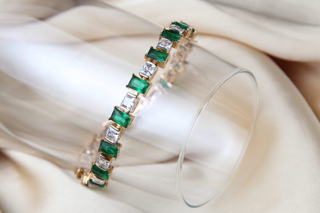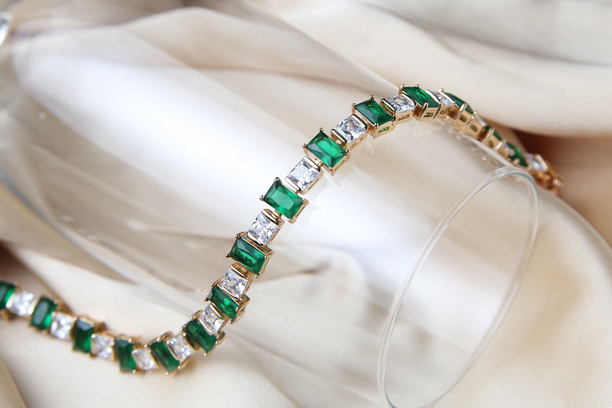 Step into the world of timeless elegance with the Emerald Radiance Bracelet, a masterpiece that embodies sophistication and grace. This stunning bracelet is a perfect blend of opulence and versatility, making it an essential addition to any jewelry collection. Adorned with alternating emerald-green and white zirconia stones, this bracelet radiates a refined charm. The gold-plated setting enhances the depth of the gemstones, creating a luxurious contrast that is both eye-catching and elegant.