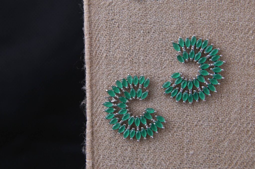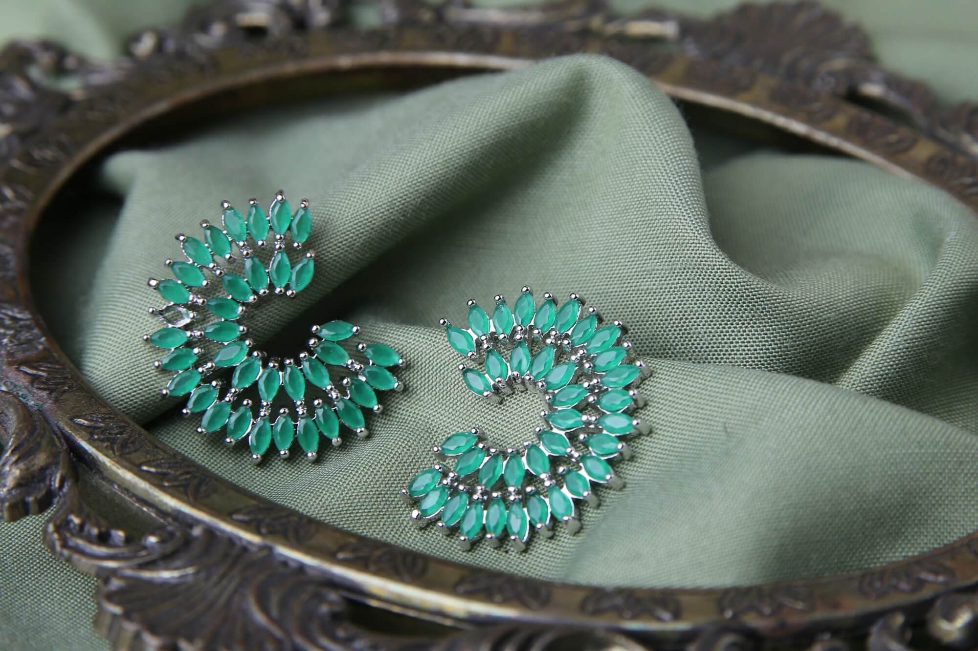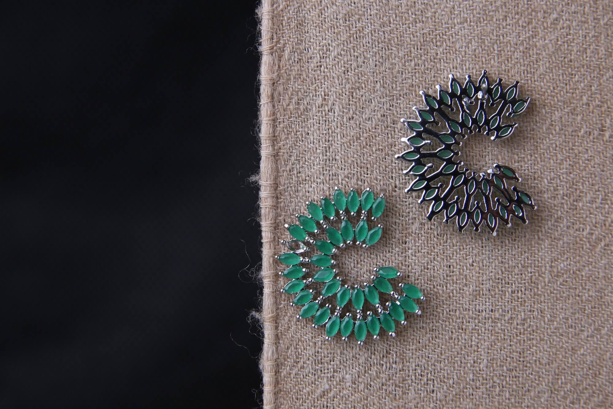 Make a bold statement with these exquisite emerald-toned spiral earrings. Featuring marquise-cut stones arranged in a mesmerizing swirl, these earrings bring a touch of nature’s beauty with a modern, artistic twist. Set in a silver-tone base, the vibrant green stones add an elegant pop of color, making them the perfect accessory for both special occasions and chic everyday wear.
