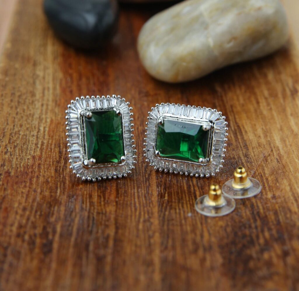 Add a touch of sophistication to your collection with our Luxe Emerald Square Stud Earrings. Featuring a stunning emerald-hued center stone framed by radiant clear baguette crystals, these earrings exude elegance and glamour. The intricate design and polished silver setting enhance the rich green color, making these earrings a standout accessory for any occasion. Designed for comfort and security, they come with a secure backing to ensure a perfect fit. Perfect for adding a bold yet refined statement to both casual and formal outfits, these earrings are a timeless addition to your jewelry wardrobe. Shine bright with these exquisite pieces!