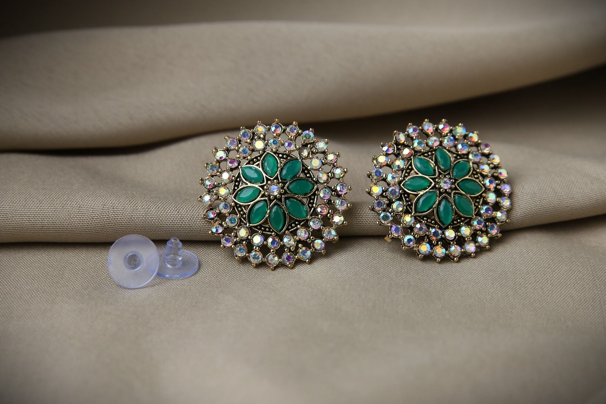 With our Enchanted Floral Stud Earrings, you may immerse yourself in the world of elegance. These lovely earrings have a colorful core design embellished with rich green stones and a halo of glittering gemstones that catch the light beautifully. The beautiful flower pattern adds a touch of refinement, making these earrings appropriate for both casual and formal events. It also contains the hue sky blue color. These stunning earrings will illuminate your style and make a statement, giving a pop of color and charm to any ensemble.