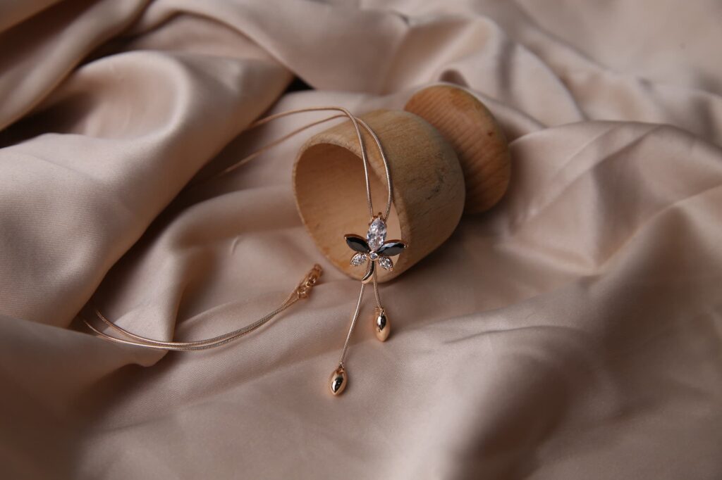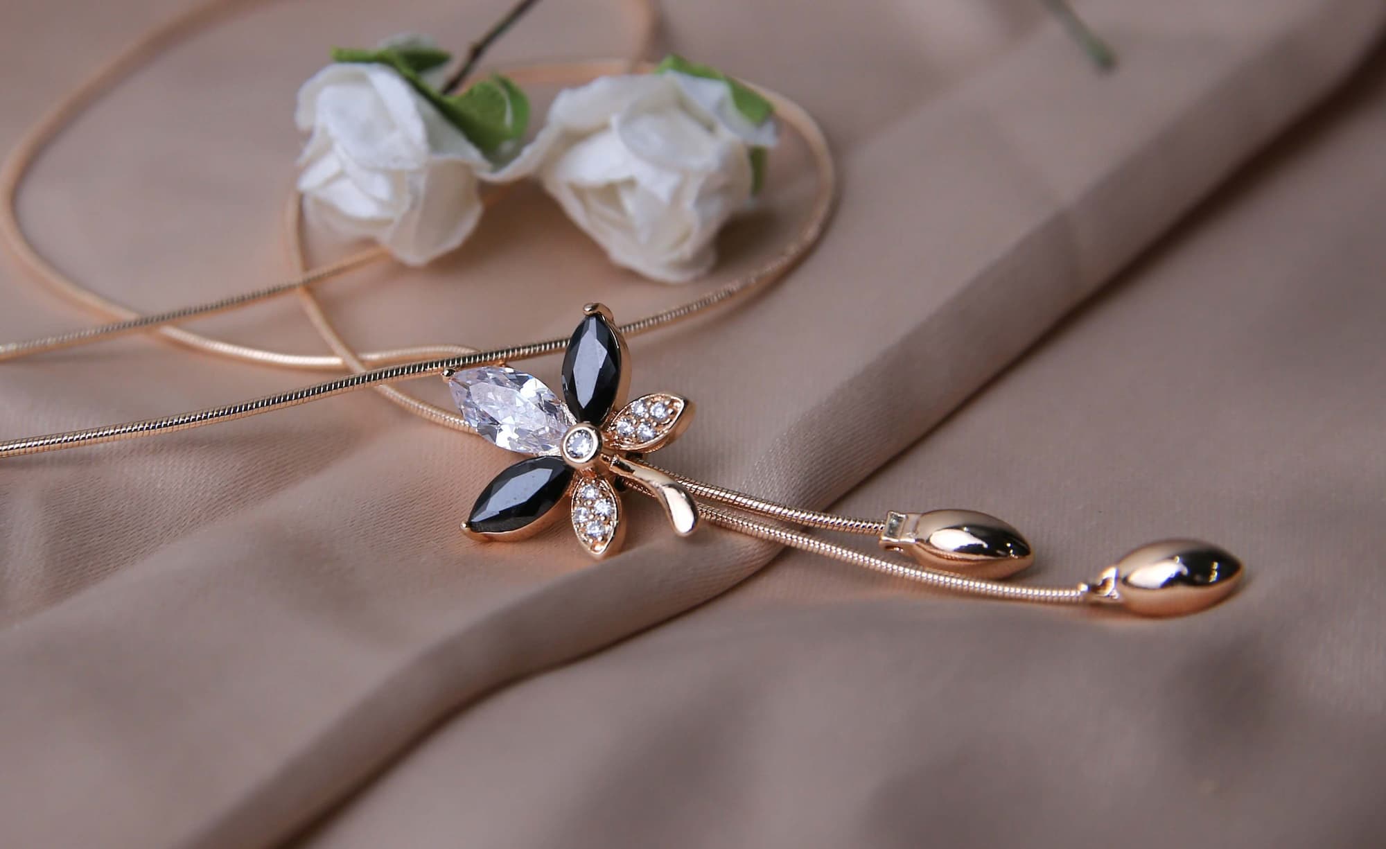 This exquisite piece of jewelry has a small pendant in the shape of a flower that is set with glittering jewels. The pendant features a mix of transparent and black stones that are enhanced by fine gold accents. Sleek and adjustable, the chain hangs elegantly, and it rests on a background of soft, neutral fabric. It is the ideal accessory for both formal and informal settings because of its overall elegant and charming design.