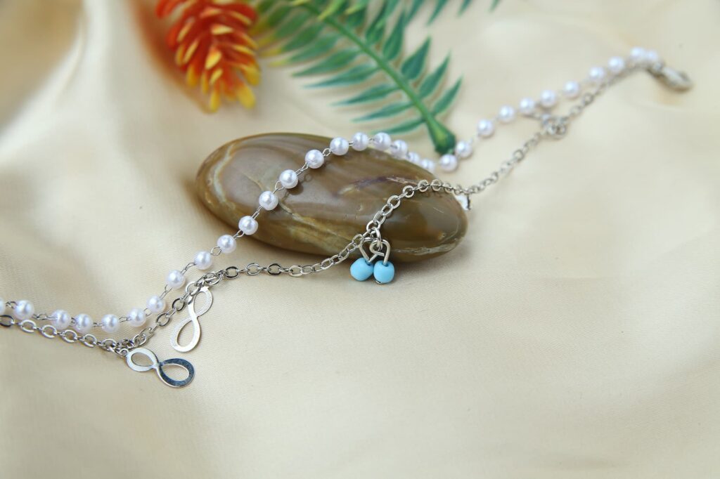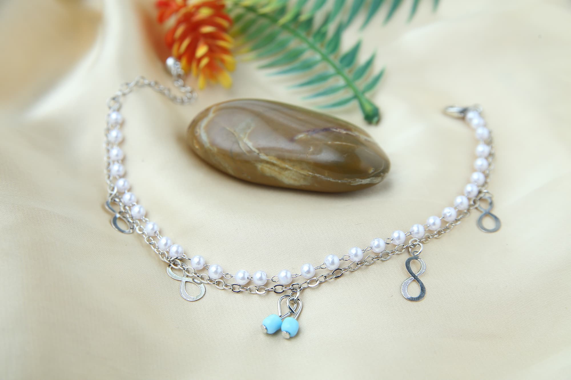 This gorgeous Anklet has two layers that showcase a combination of delicate silver chain and glossy pearl beads. Enhanced by endearing infinity motifs and a whimsical turquoise charm, this piece exudes elegance and timeless style, rendering it an ideal addition for any setting.