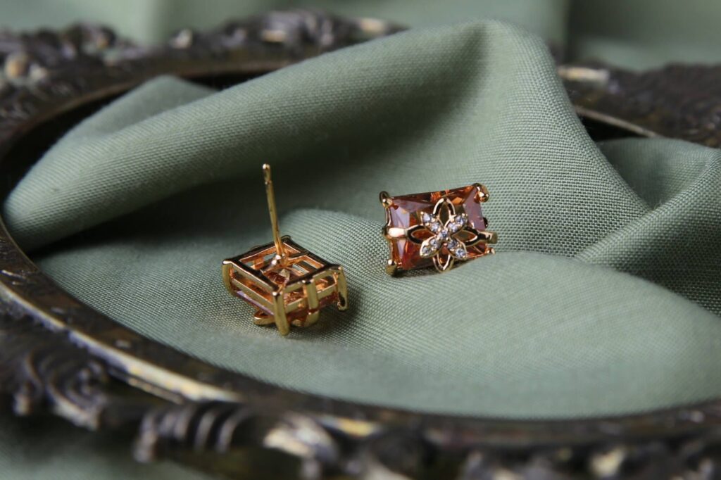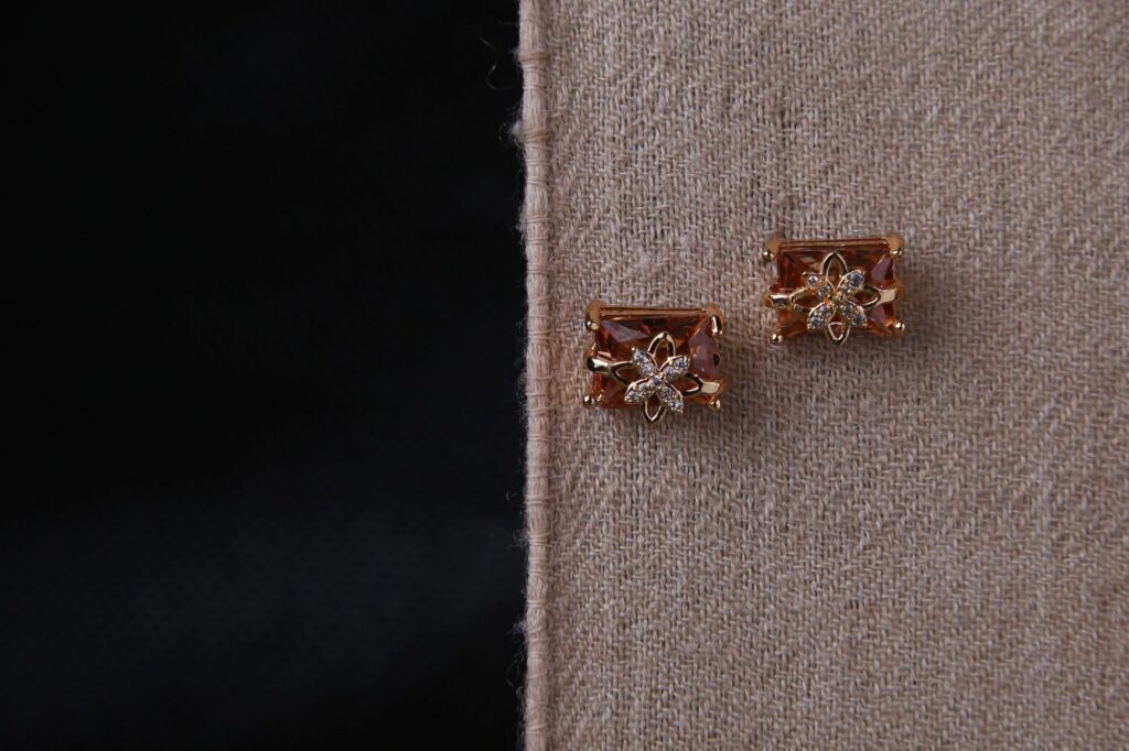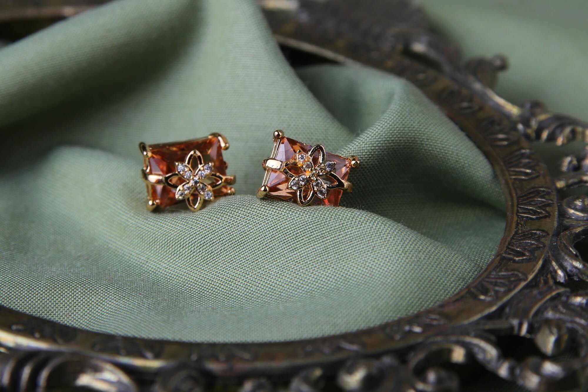 These elegant earrings feature square-cut amber gemstones set in gold. Each stud is adorned with a delicate flower design made of small clear crystals. The warm amber color contrasts beautifully with the sparkling accent stones. Perfect for both casual and formal occasions.