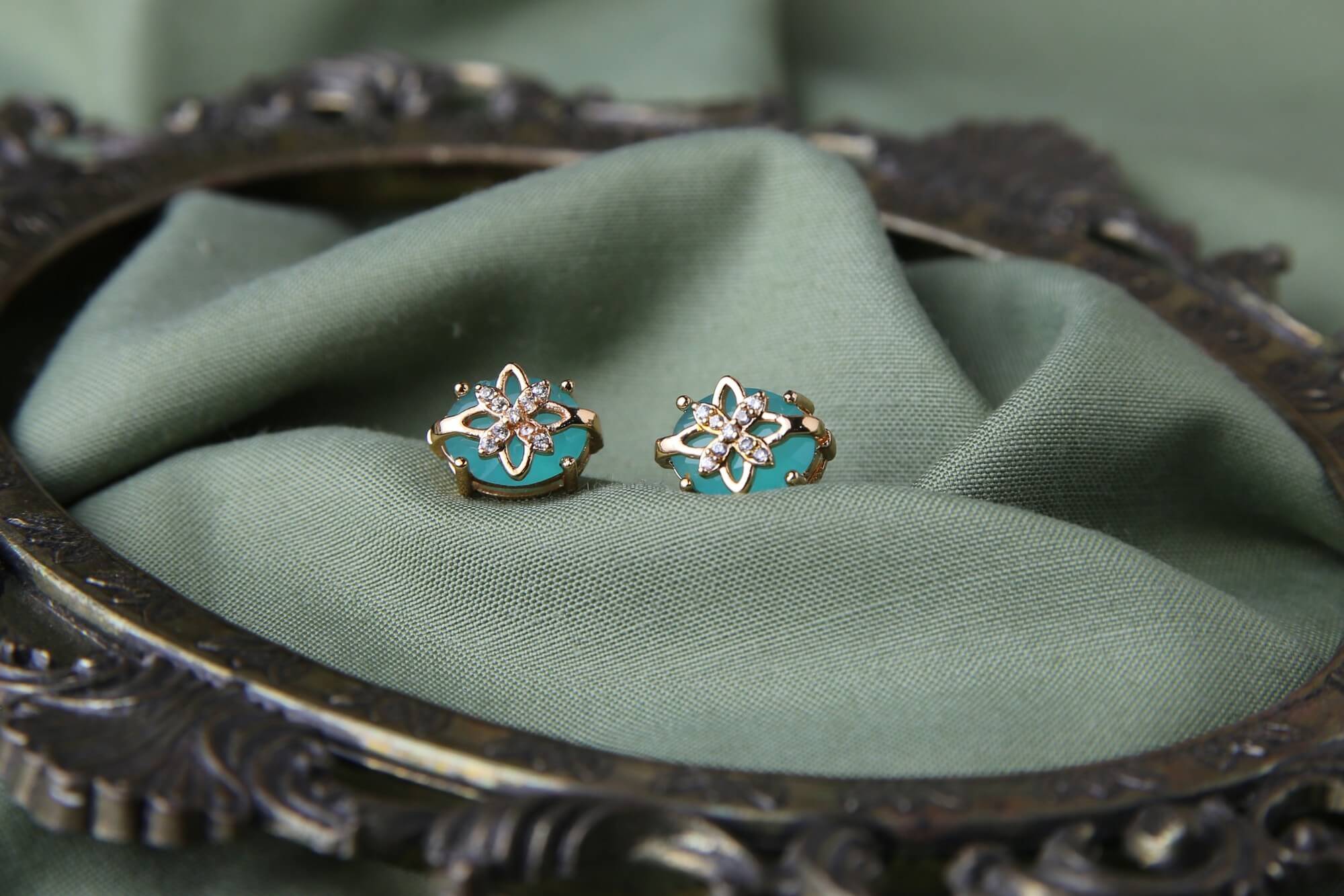 Add a touch of sophistication to your jewelry collection with these exquisite gold-plated studs. Featuring a delicate floral design encrusted with shimmering crystals, they beautifully complement the serene turquoise backdrop. Perfect for everyday elegance or special occasions.