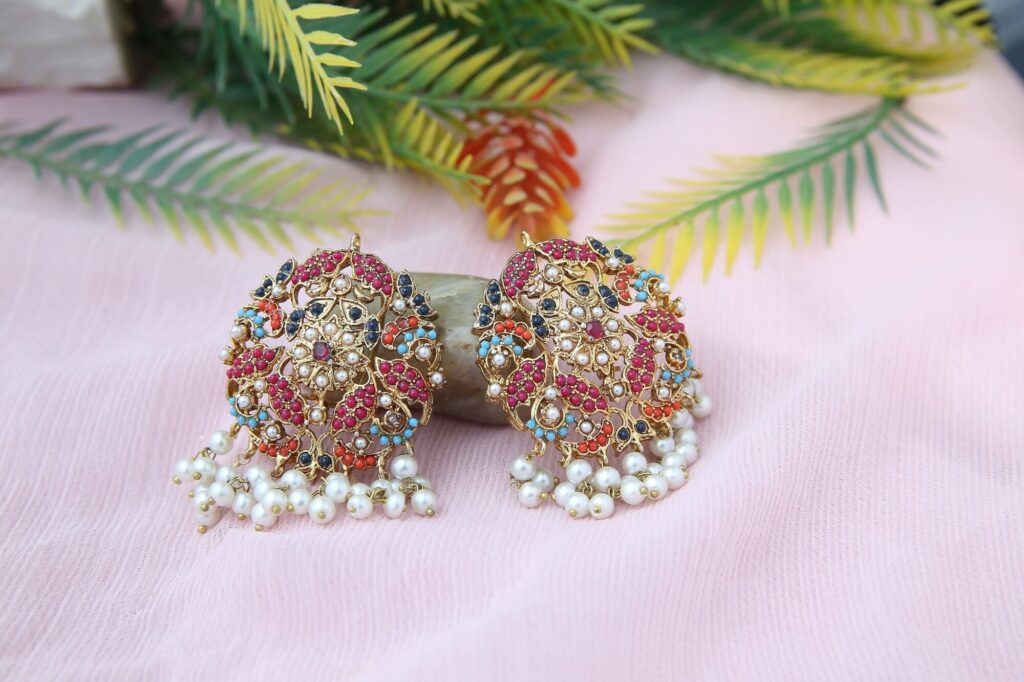 This gorgeous choker represents a masterwork of traditional jewelry making. A colorful, elaborate centerpiece steals the show, while a delicate thread of pearls creates the base. The pendant features a gorgeous flower design and is embellished with vibrant gemstones and gold-toned filigree work. A hint of elegance and movement is added by the pearl tassels that dangle. This choker adds a touch of luxury to any outfit, making it the ideal accessory for special occasions or daily wear.