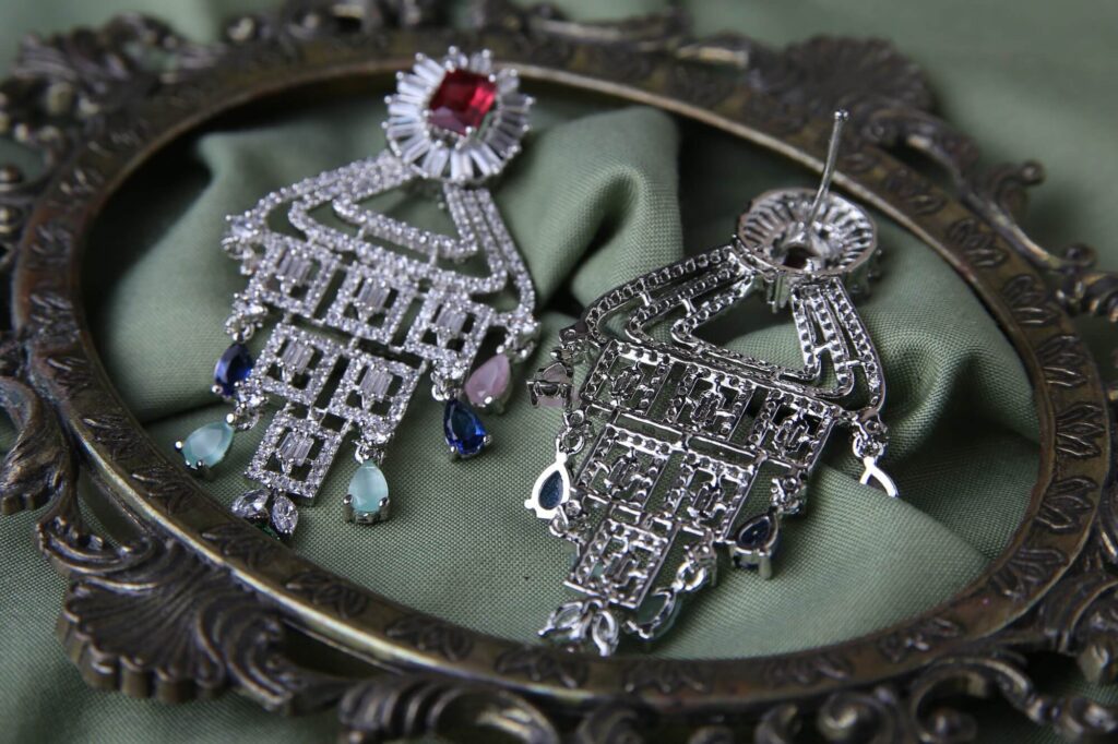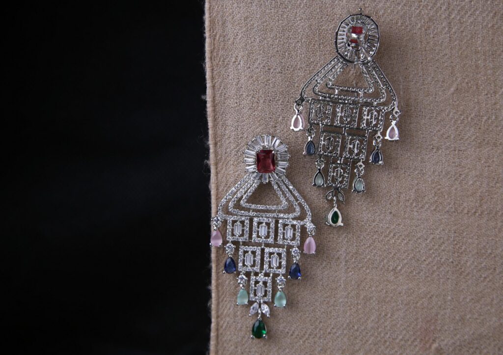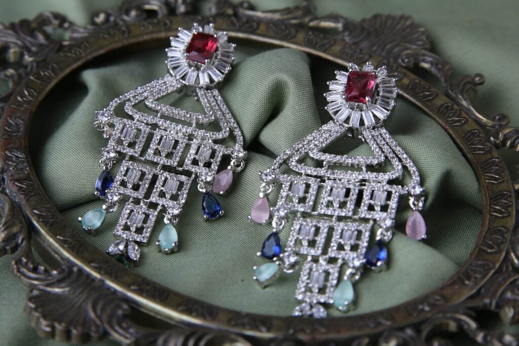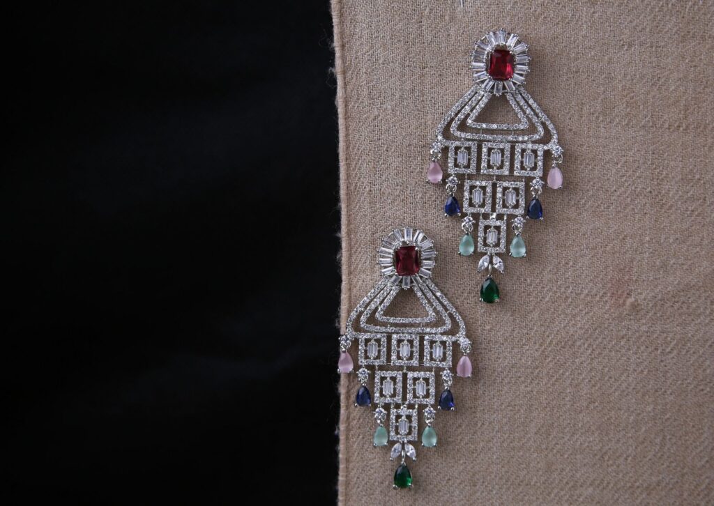 These stunning statement earrings feature a geometric design with rectangular ruby-colored gemstones at the top surrounded by baguette diamonds in a sunburst pattern. The earrings have a triangular framework of diamond pavé, with a lattice-like structure below featuring alternating clear baguette stones. The bottom is adorned with colorful gemstone drops in blue sapphire, light green aquamarine, and pale pink rose quartz, creating a multi-colored cascade effect.