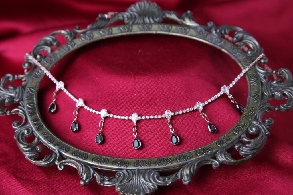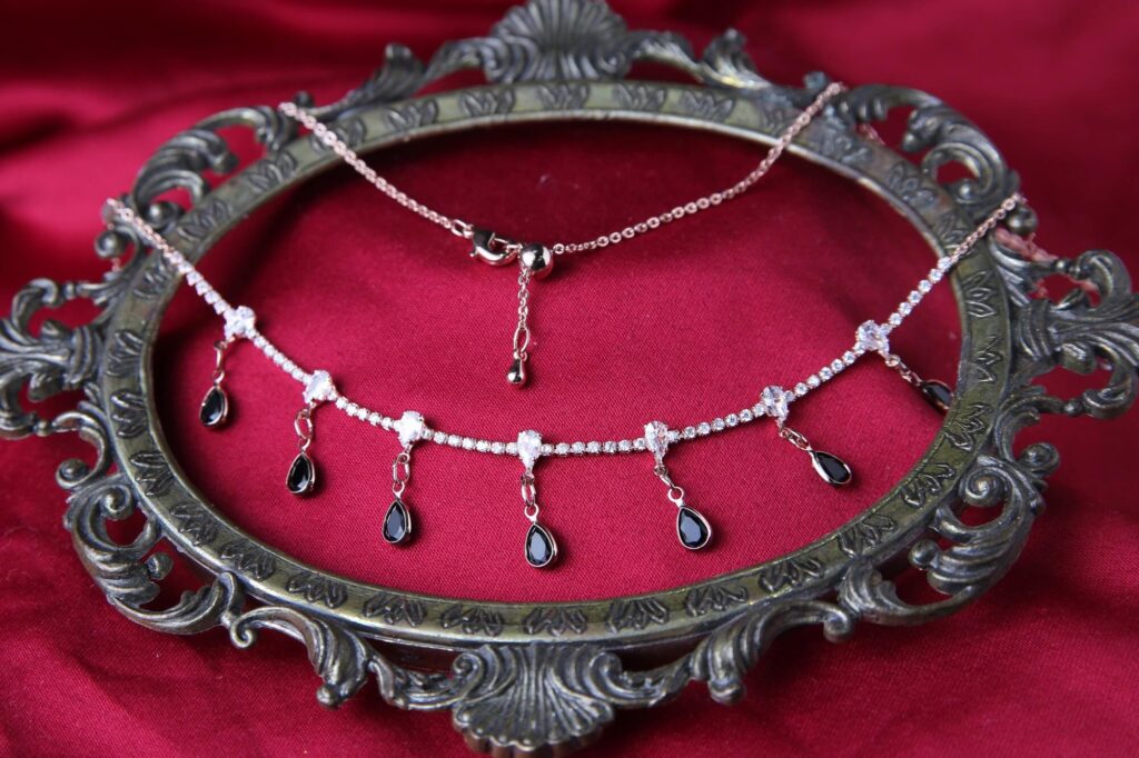 This striking layered necklace combines classic sparkle featuring a beautiful rose gold-tone finish. The lower strand is a delicate choker composed of brilliant white cubic zirconia stones, spaced out with larger, sparkling cubic zirconia. Dangling from these stations are elegant teardrop charms crafted from deep black cubic zirconia, creating a captivating contrast and movement. A finer, plain rose gold-tone chain completes the sophisticated stacked look. Secured with a lobster clasp and an adjustable extender, this piece offers a perfect blend of modern glamour and dark romance, making it an ideal accessory for evening wear.
