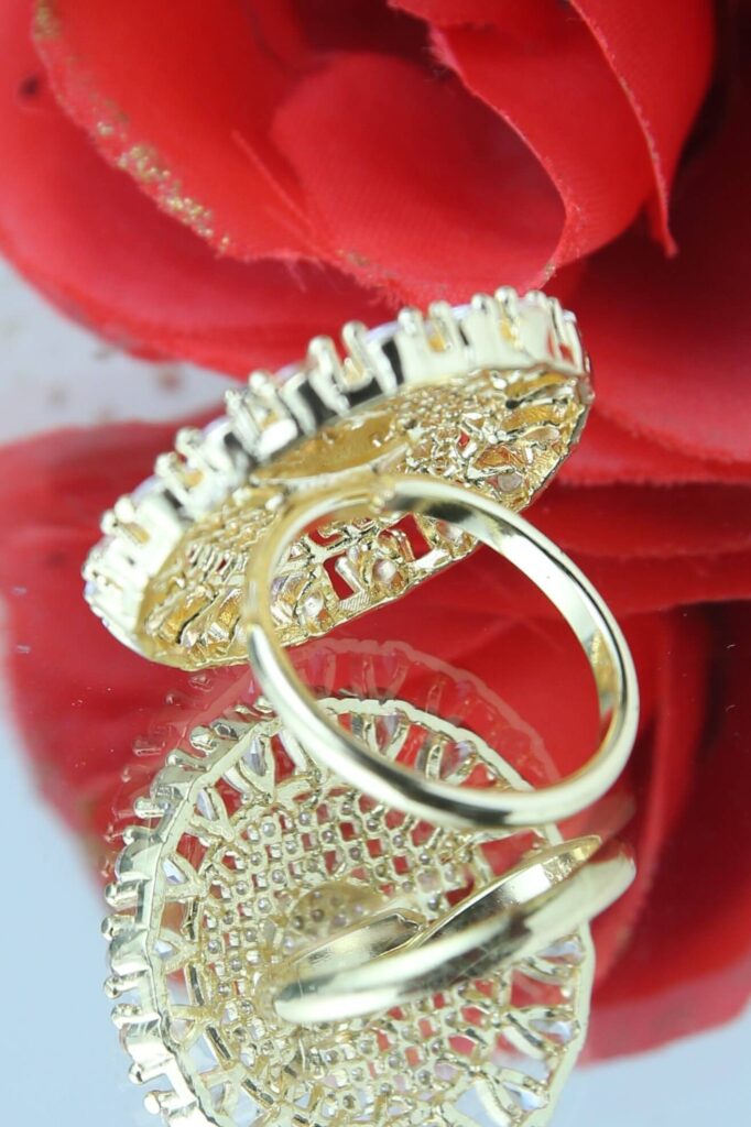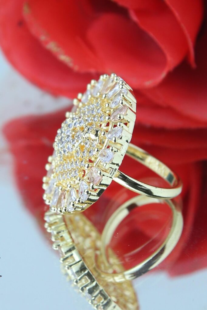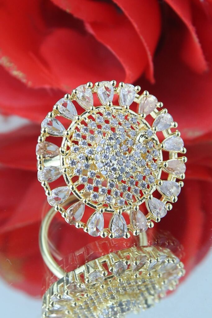 Step into elegance and sophistication with this exquisite gold and zircon halo ring, designed to captivate attention with its mesmerizing brilliance. The intricately arranged shimmering white zircon stones, set in a stunning gold-plated base, create a radiant, sunburst-inspired design that exudes glamour and grace.