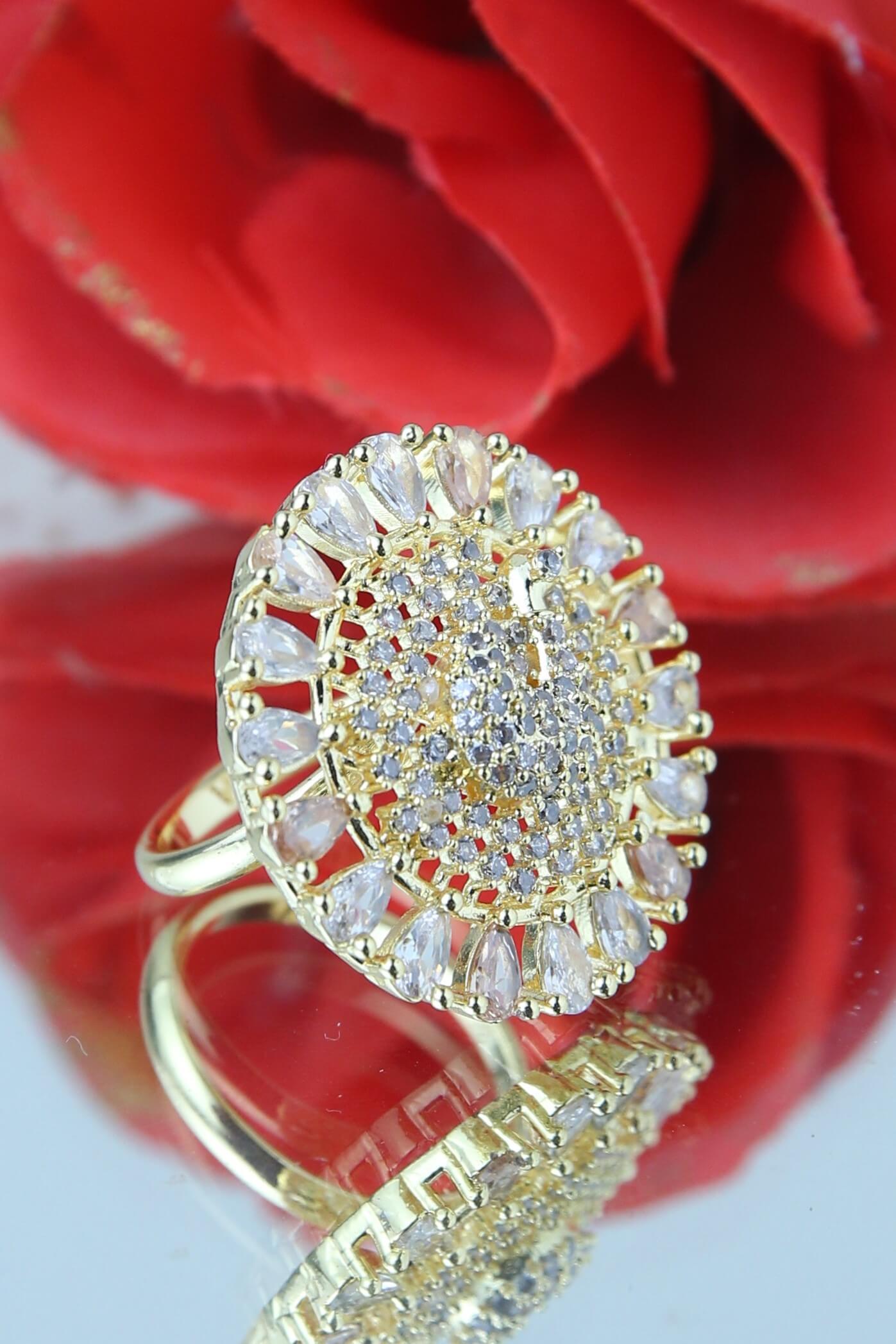 Step into elegance and sophistication with this exquisite gold and zircon halo ring, designed to captivate attention with its mesmerizing brilliance. The intricately arranged shimmering white zircon stones, set in a stunning gold-plated base, create a radiant, sunburst-inspired design that exudes glamour and grace.