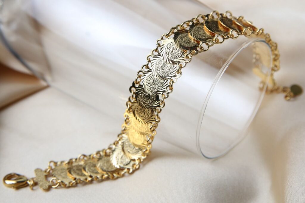 Embrace a touch of timeless elegance with this stunning gold-toned coin bracelet, a piece that beautifully blends classic design with cultural inspiration. Each coin-shaped link is meticulously detailed with intricate patterns, creating a captivating visual texture. The warm, rich gold tone enhances the bracelet’s luxurious appeal, making it a standout accessory for any occasion. It makes a thoughtful and cherished gift, ideal for birthdays, anniversaries, Eid celebrations, or as a special token of appreciation for a loved one.