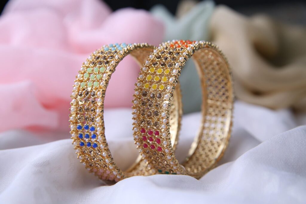 These pairs showcase beautifully designed gold bangles adorned with multi-colored gemstones. The combination of colors and textures creates a truly eye-catching and elegant piece of jewelry. The gold base provides a rich and elegant finish, making these bangles suitable for festive occasions or cultural celebrations. These bangles are perfect for adding a touch of glamour to any outfit and are suitable for both casual and formal occasions.