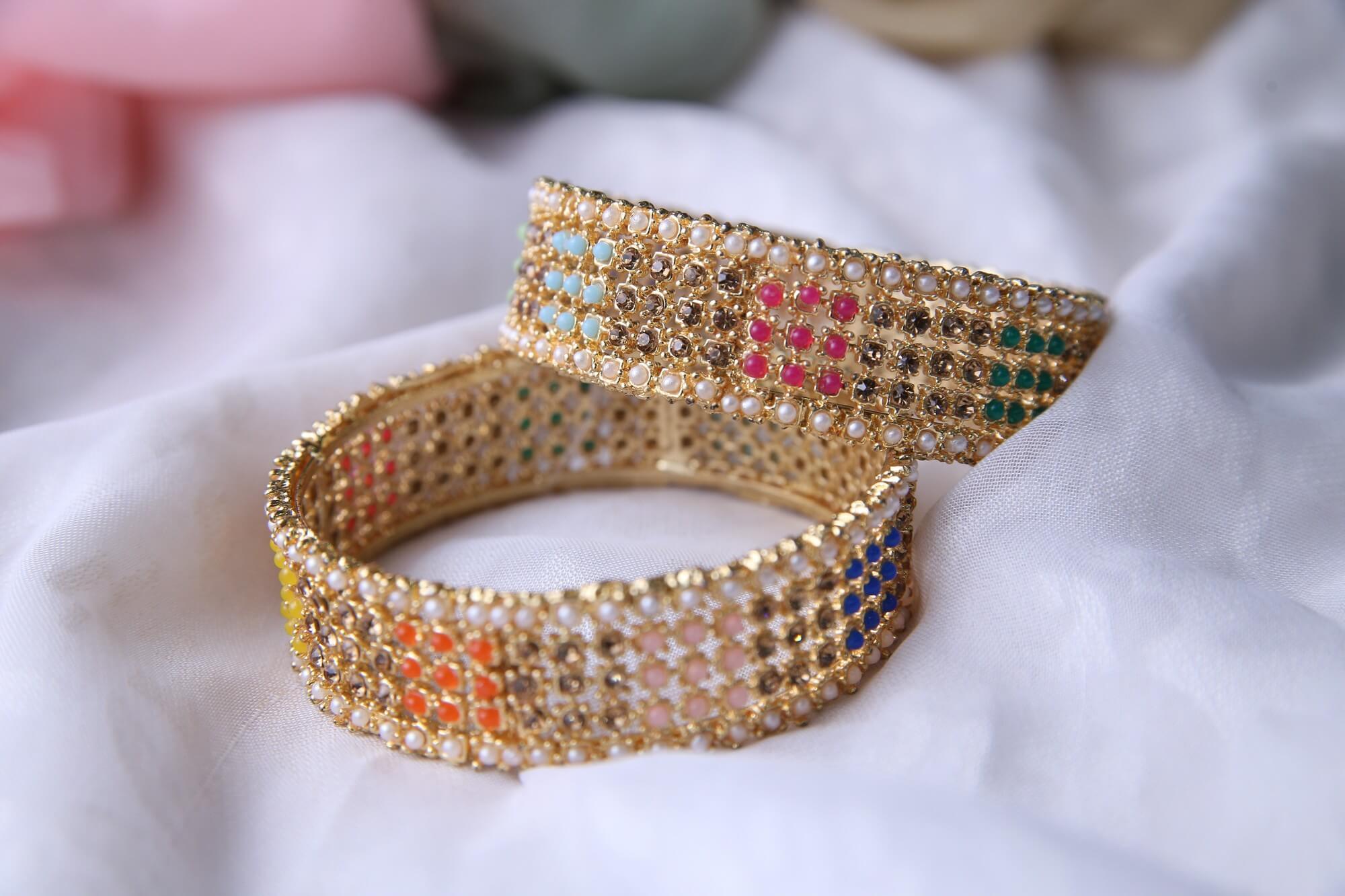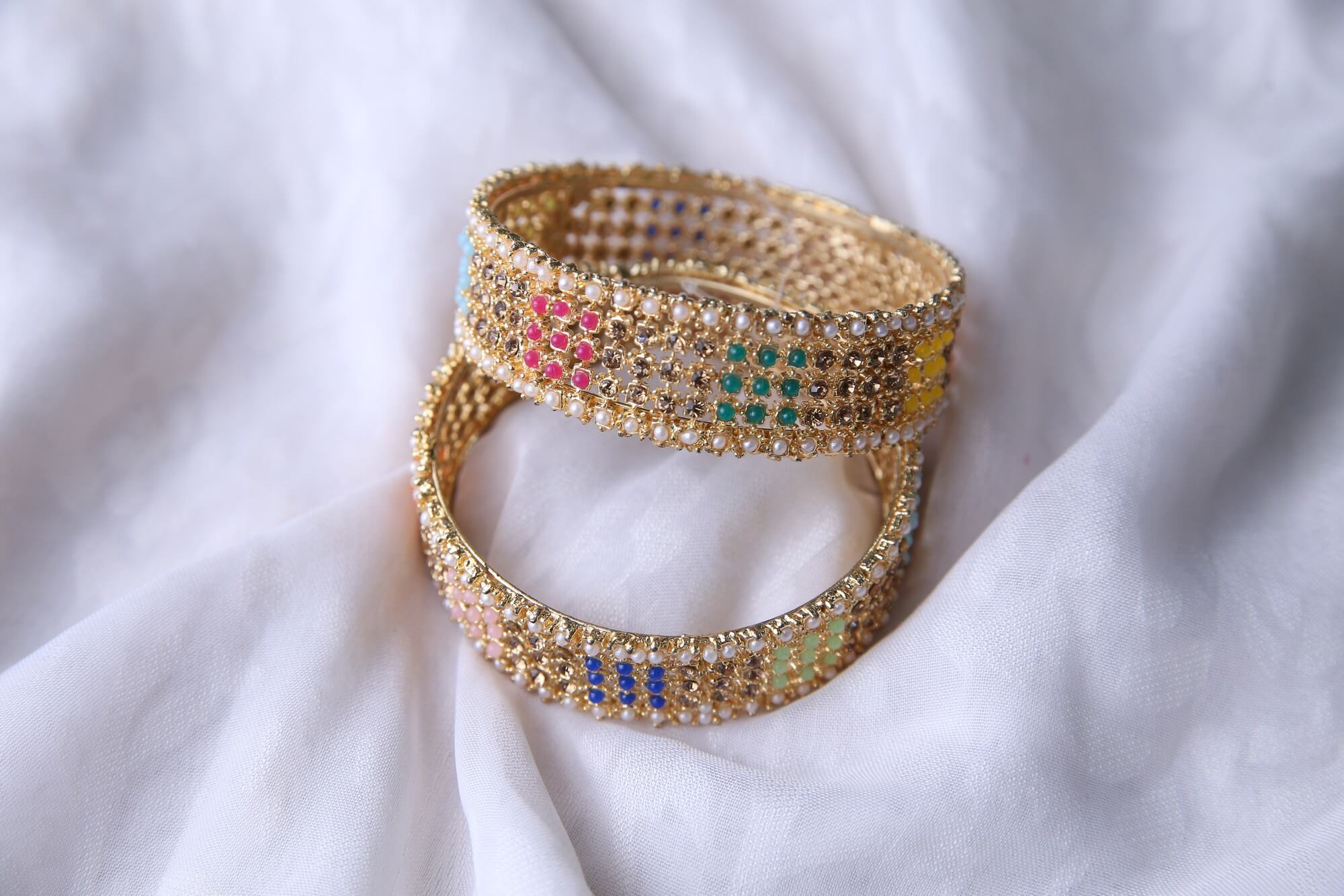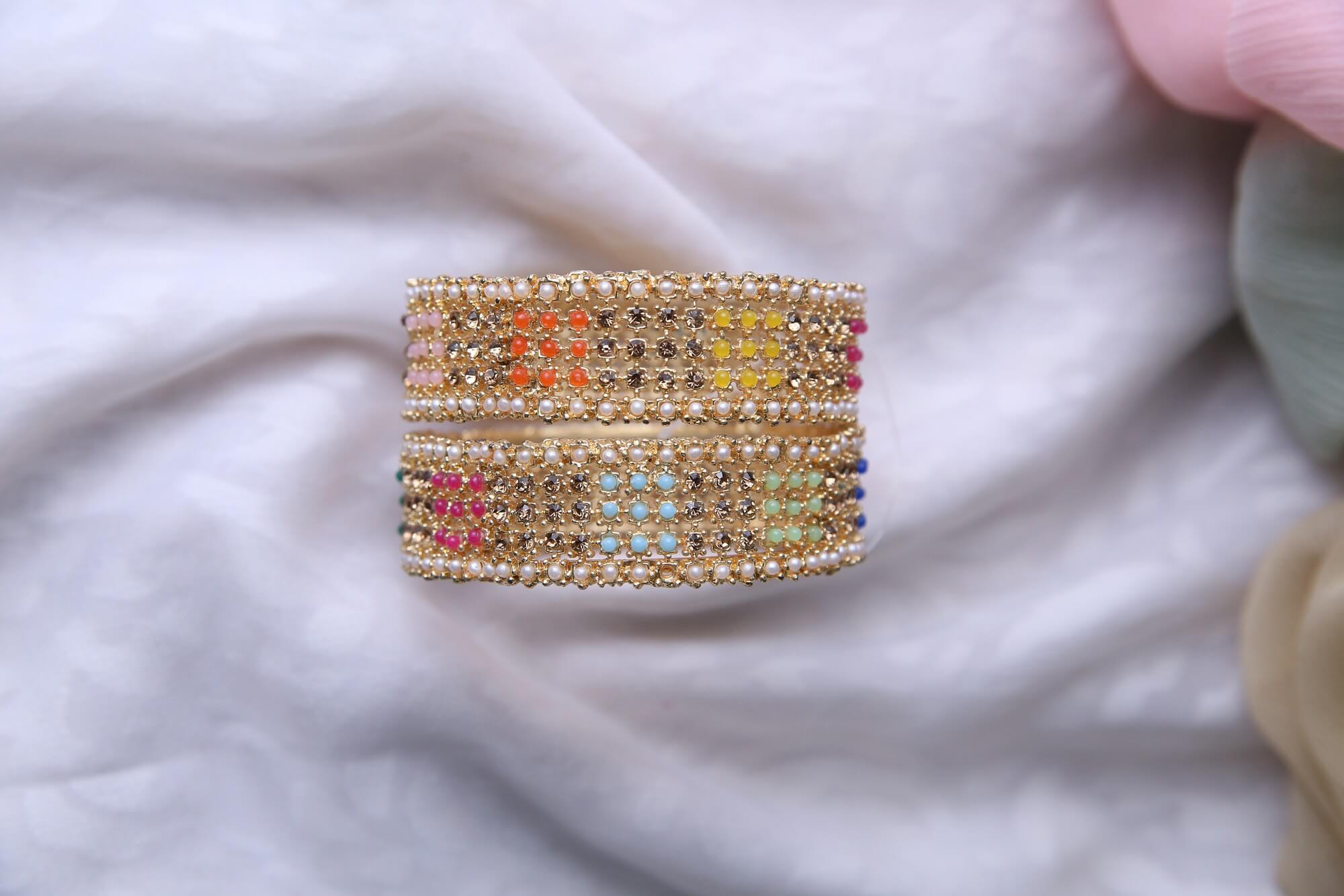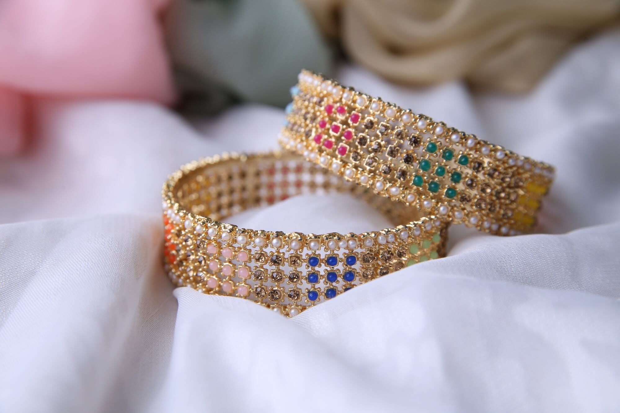 These pairs showcase beautifully designed gold bangles adorned with multi-colored gemstones. The combination of colors and textures creates a truly eye-catching and elegant piece of jewelry. The gold base provides a rich and elegant finish, making these bangles suitable for festive occasions or cultural celebrations. These bangles are perfect for adding a touch of glamour to any outfit and are suitable for both casual and formal occasions.
