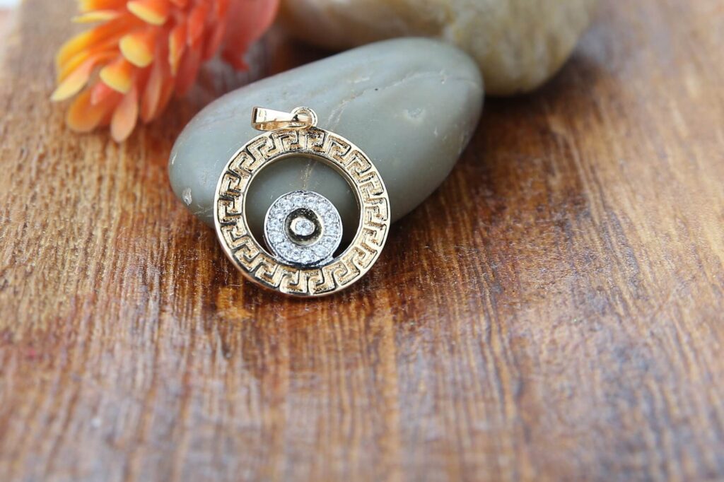 This exquisite pendant features a dazzling circle of diamonds set within a golden frame, creating a captivating eye-like design. The delicate detailing of the gold frame adds a touch of elegance, making it a truly beautiful and eye-catching piece of jewelry.