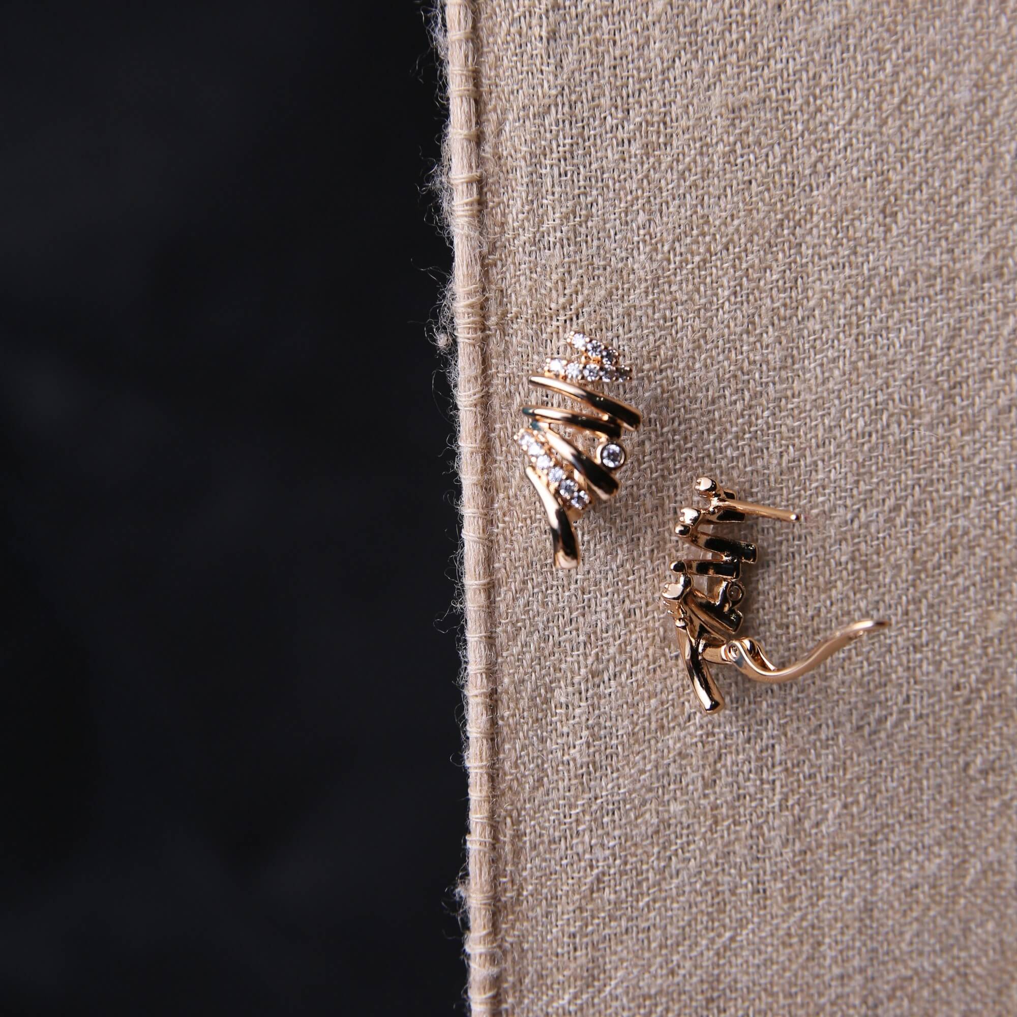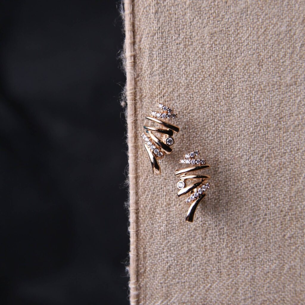Add a touch of sculptural modernism to your jewelry collection with these captivating ribbon-style stud earrings. Featuring a series of polished gold-tone bands that gracefully overlap in a dynamic, wrapped design. The fluid metalwork is accented with delicate, brilliant-cut zirconia stones along the top curves, providing a sophisticated shimmer that catches the light beautifully. These studs balance edgy architectural details with classic elegance, making them an ideal choice for elevating a professional wardrobe or adding a contemporary finish to your evening attire.
