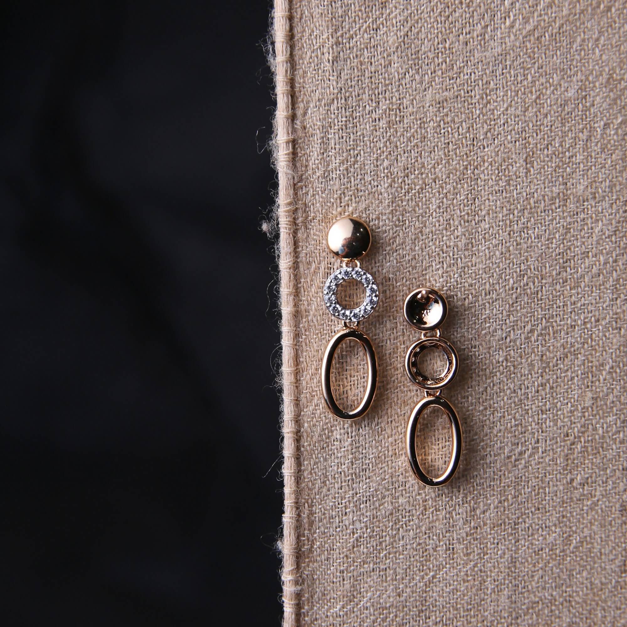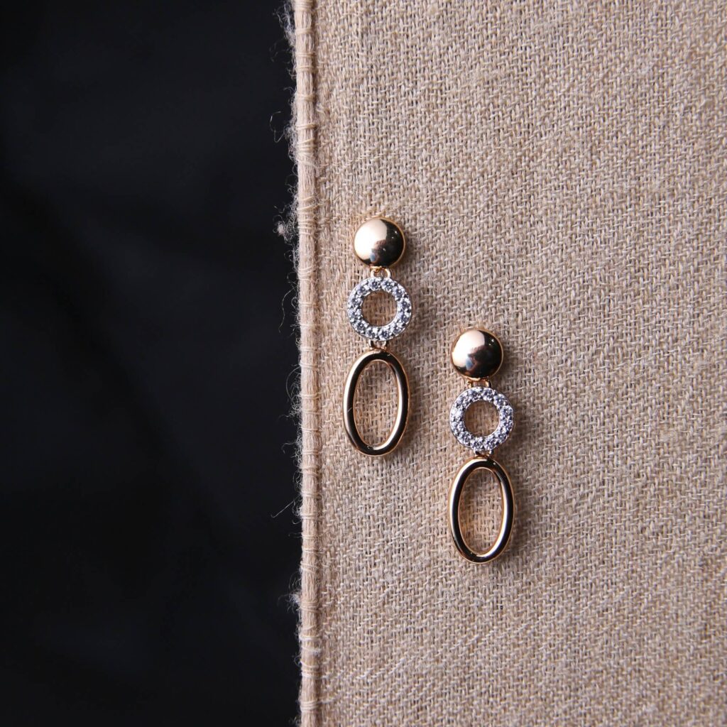 Introduce a touch of modern artistry to your style with these captivating geometric drop earrings. Featuring a sophisticated three-tiered design, each earring begins with a polished gold-tone stud that suspends a shimmering, zircon-encrusted circle. The look is completed with a sleek, elongated gold-tone oval drop, creating a beautiful sense of balance and movement. The contrast between the brilliant pave-set stones and the smooth, high-polish metal offers a luxurious finish that transitions effortlessly from professional settings to elegant evening affairs.