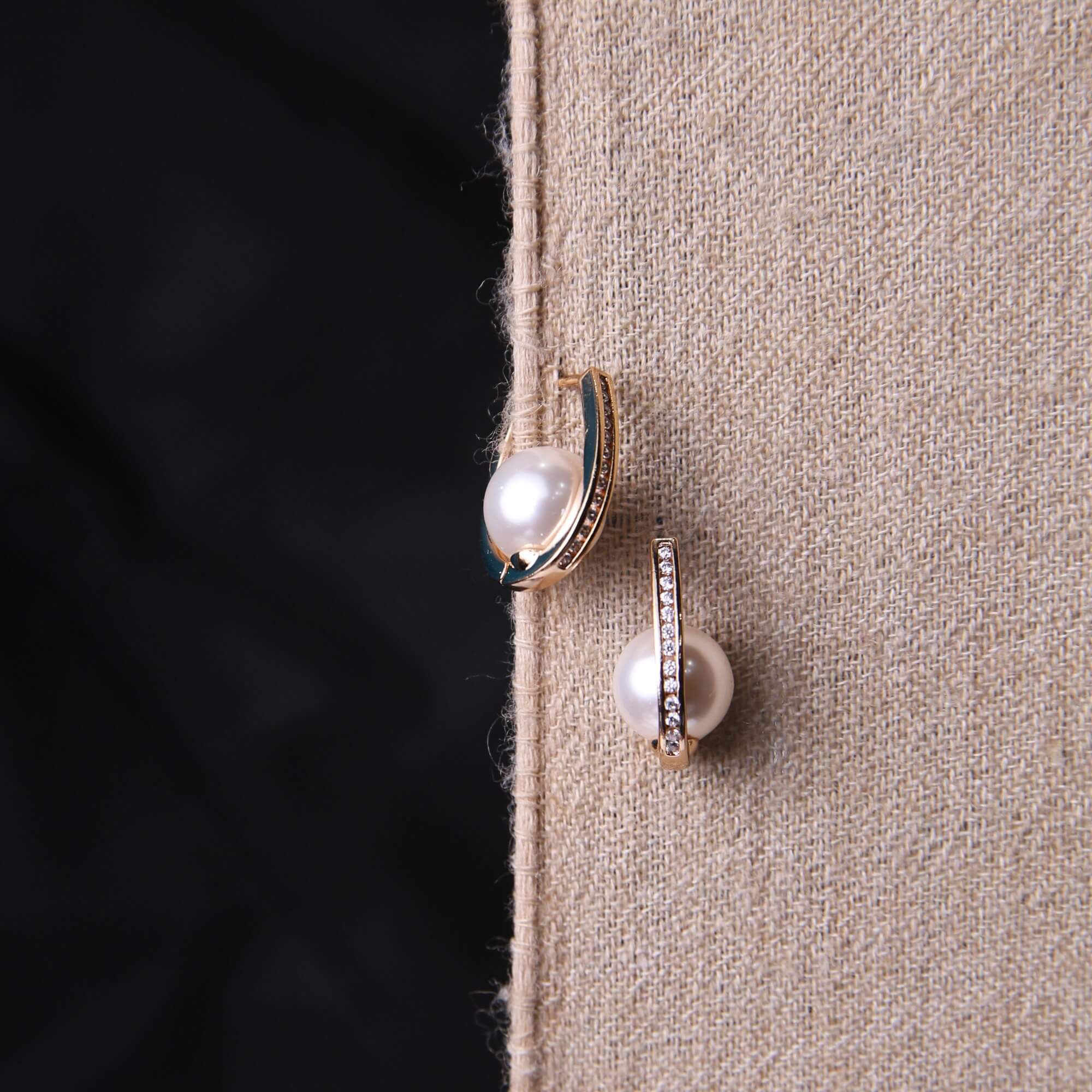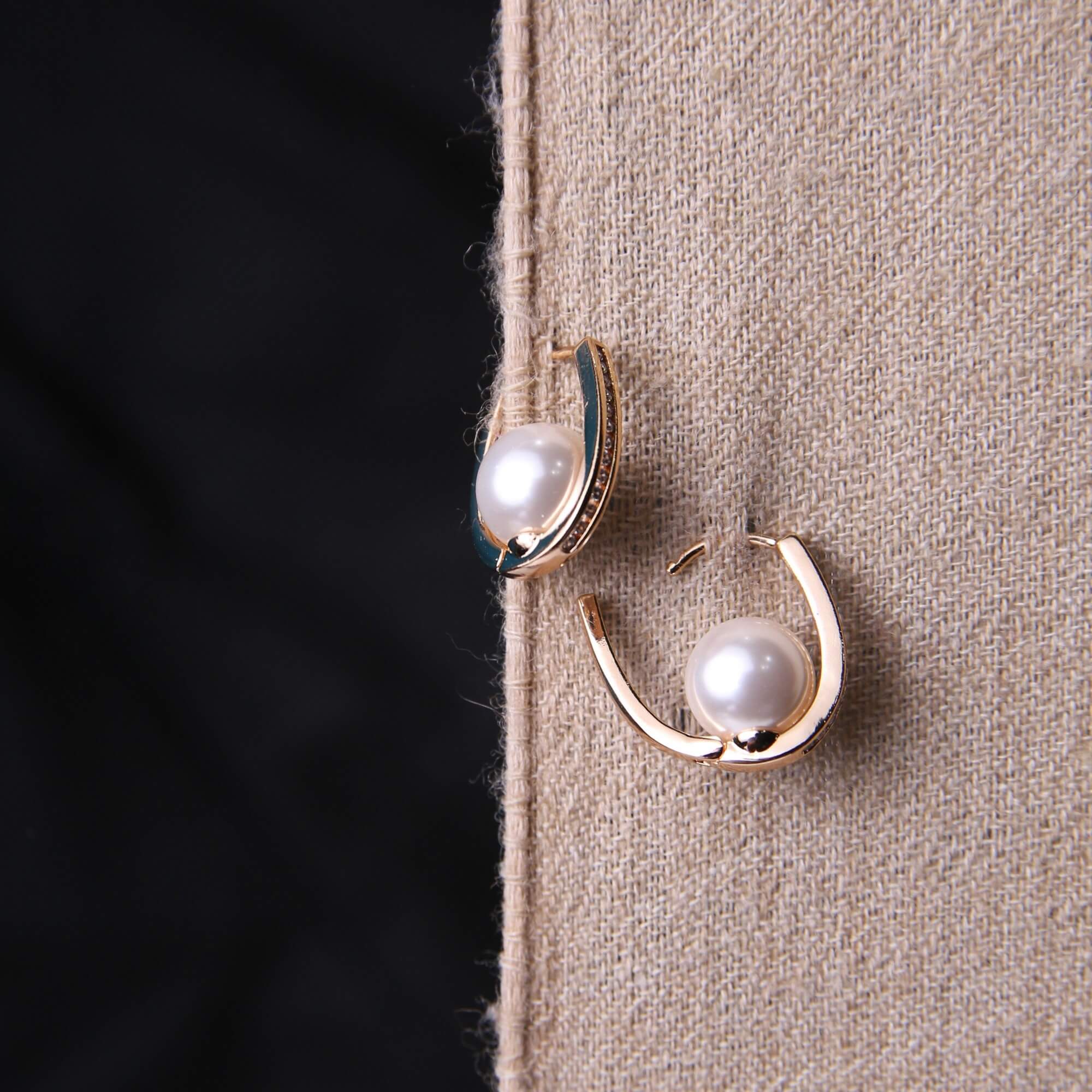 A true masterclass in modern minimalist jewelry, these unique hoops redefine traditional pearl accessories. Each earring features a sleek, U-shaped gold-tone band that gracefully cradles a single, high-luster white pearl within its curve. The architectural design is enhanced by a subtle row of shimmering zirconia stones along the side, adding a whisper of sparkle to the high-polish gold finish. These earrings offer a sophisticated look that is both edgy and timeless, perfect for the contemporary woman who wants to make a quiet yet powerful style statement.