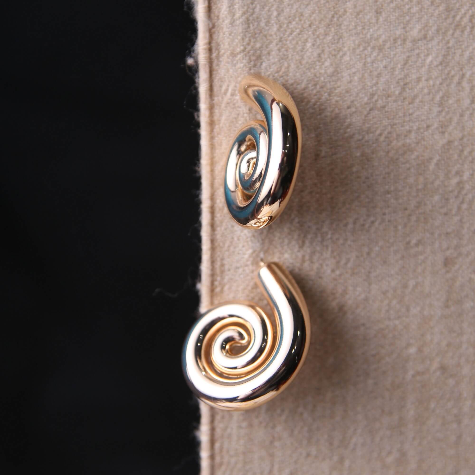 Add an artistic flair to your look with these striking sculptural stud earrings. Crafted in a high-polish gold-tone finish, the design features a fluid, three-dimensional spiral that mimics the organic elegance of a shell. The smooth, mirror-like surface is designed to catch and reflect light beautifully, providing a bold yet refined aesthetic. These earrings offer a contemporary twist on a classic gold stud, making them the perfect statement piece for those who appreciate modern, architectural jewelry.