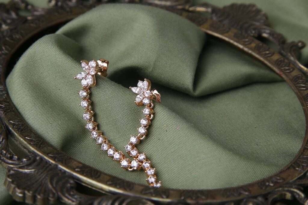 Elevate your elegance with these breathtaking floral crystal dangle earrings. Designed with sparkling cubic zirconia stones arranged in a delicate floral pattern, these earrings exude charm and sophistication. The cascading row of shimmering crystals gracefully follows the curve of the ear, creating a luxurious and refined look. Crafted with a gold-plated base, these earrings are lightweight, comfortable, and perfect for weddings, formal events, or adding a touch of glamour to your everyday style. A timeless accessory that radiates beauty and grace.