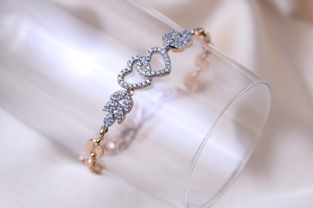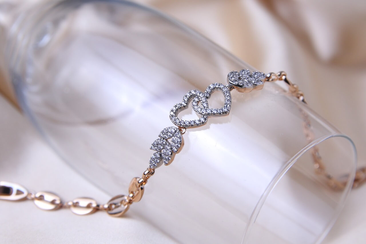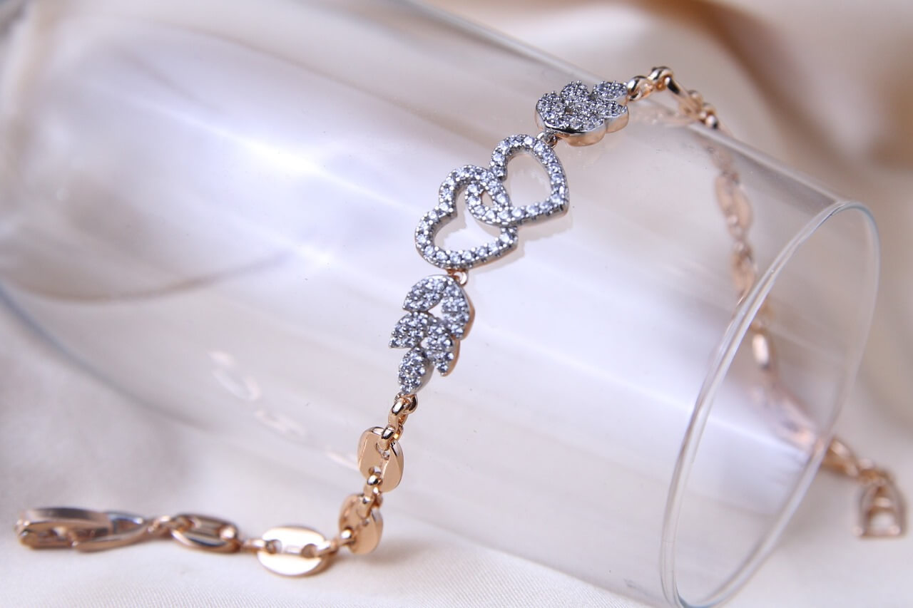 This charming bracelet features a delicate chain with a warm rose gold plating. Adorning the chain are three openwork heart-shaped charms, each fully encrusted with sparkling clear crystals. The hearts are evenly spaced along the chain, creating a balanced and elegant design. The unique chain link adds a subtle textural element to the piece. This bracelet is a perfect way to express affection or to add a touch of delicate sparkle to your everyday wear.