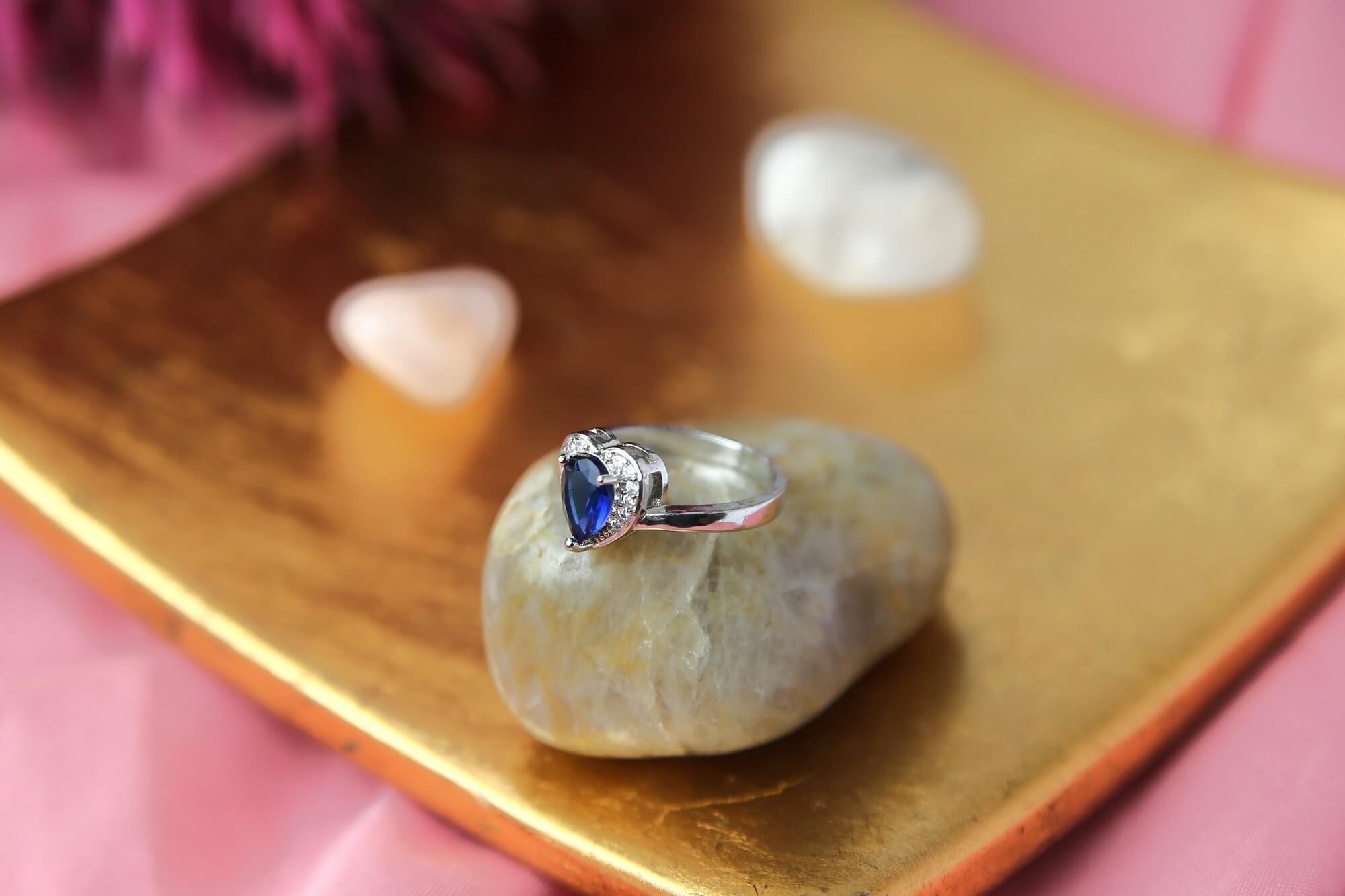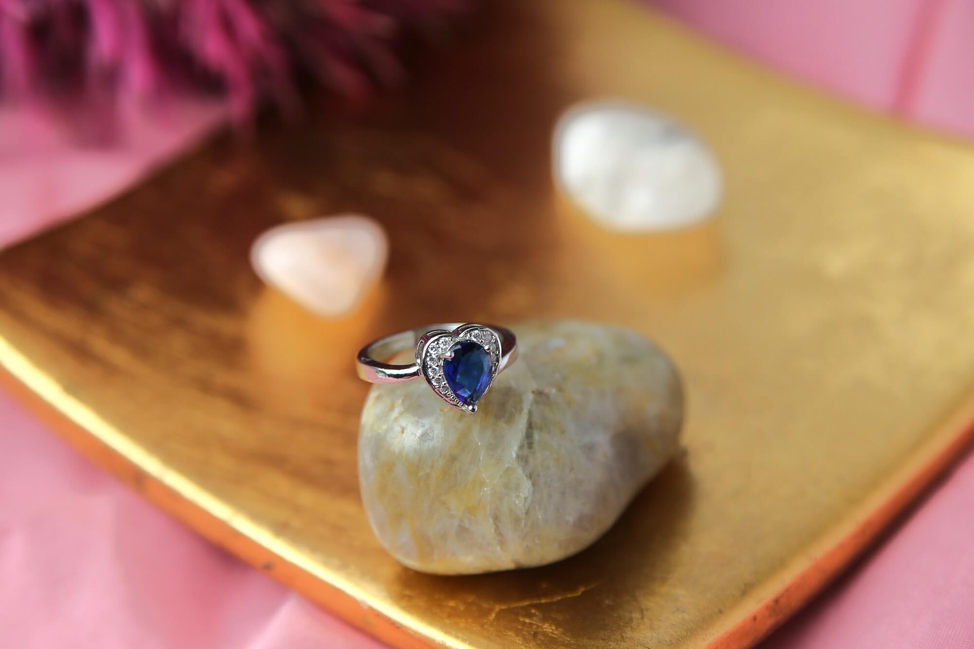 A delicate swirl of sparkling white diamonds beautifully frames the heart-shaped deep blue sapphire at the center of this stunning ring. The ring is a stunning statement piece appropriate for any event. Its smooth silver band accentuates the vivid color of the sapphire, which is set on a polished stone.
