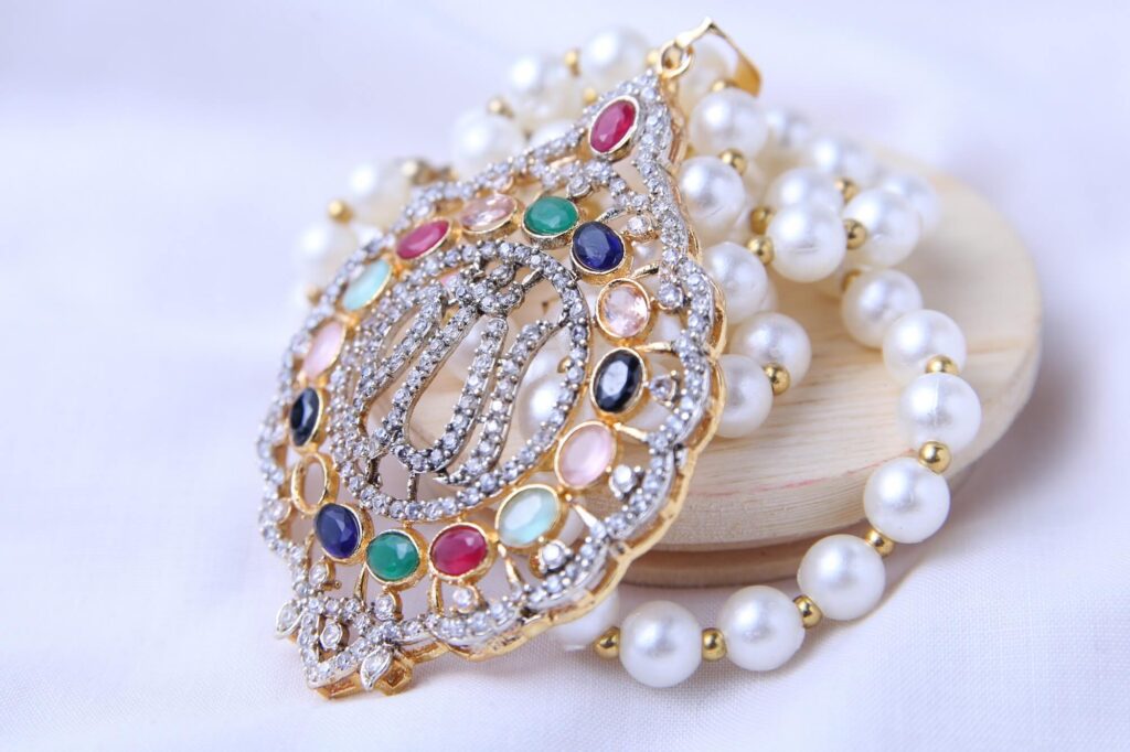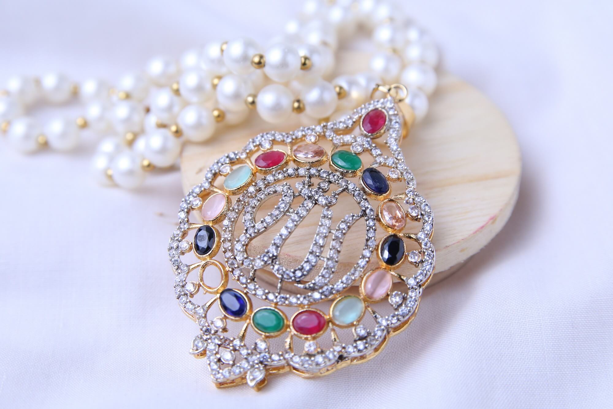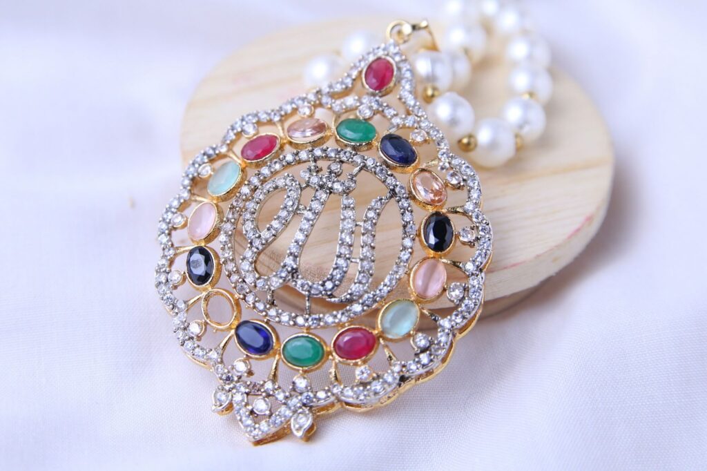 This exquisite pendant necklace and earrings set showcases a beautiful Islamic-inspired design. The pendant features an intricate, teardrop-shaped frame adorned with sparkling clear crystals and vibrant, multi-colored stones. The central design is reminiscent of traditional Islamic art, adding a touch of cultural elegance. Its intricate design, the harmonious blend of sparkling crystals and colorful gemstones, and the meaningful calligraphy make it a truly unique and cherished item.