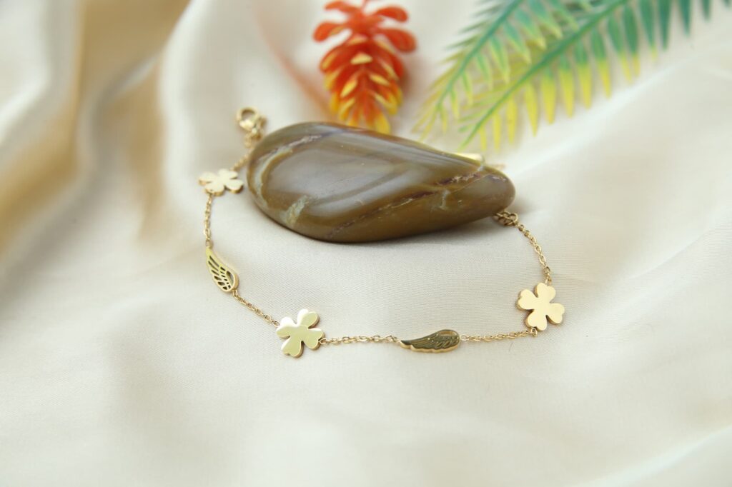 This pretty anklet has a gold chain with pendants in the shapes of clovers and leaves. The design is lively and striking because of the contrasting sizes and forms. The anklet is a flexible accessory for any event because of its subtle, feminine overall style.