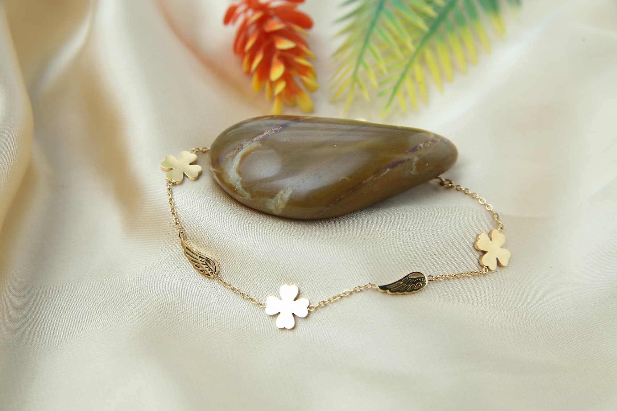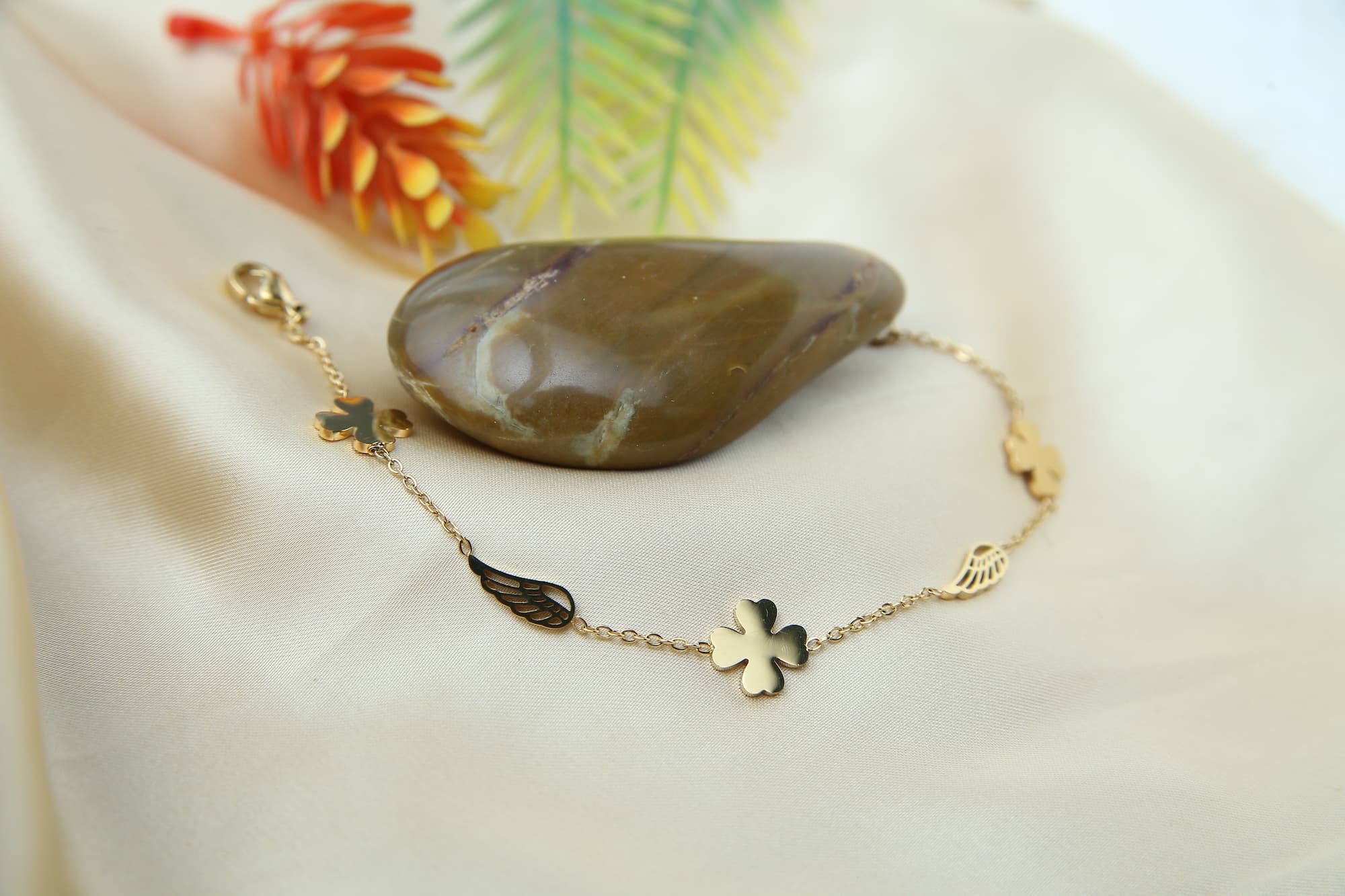 This pretty anklet has a gold chain with pendants in the shapes of clovers and leaves. The design is lively and striking because of the contrasting sizes and forms. The anklet is a flexible accessory for any event because of its subtle, feminine overall style.