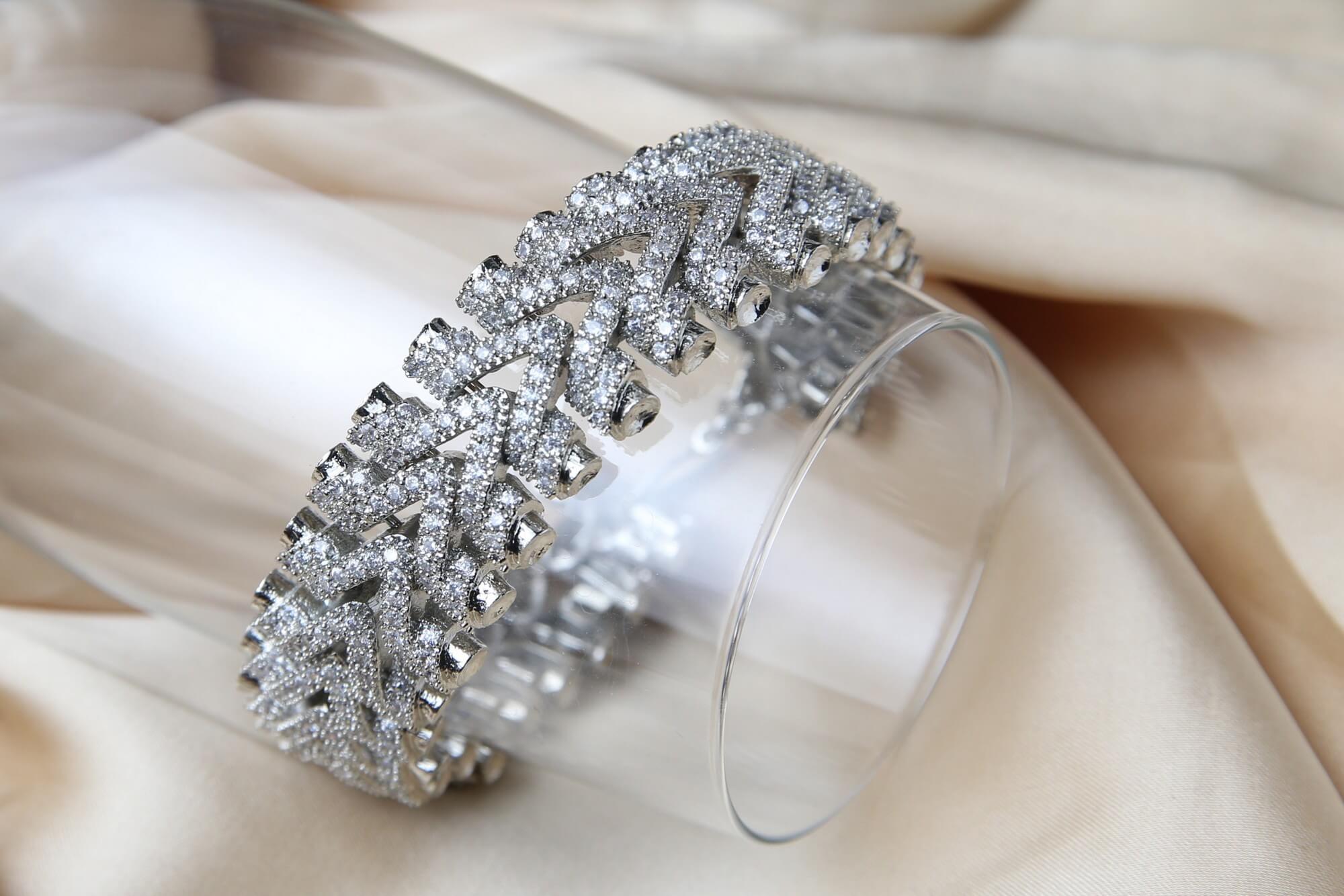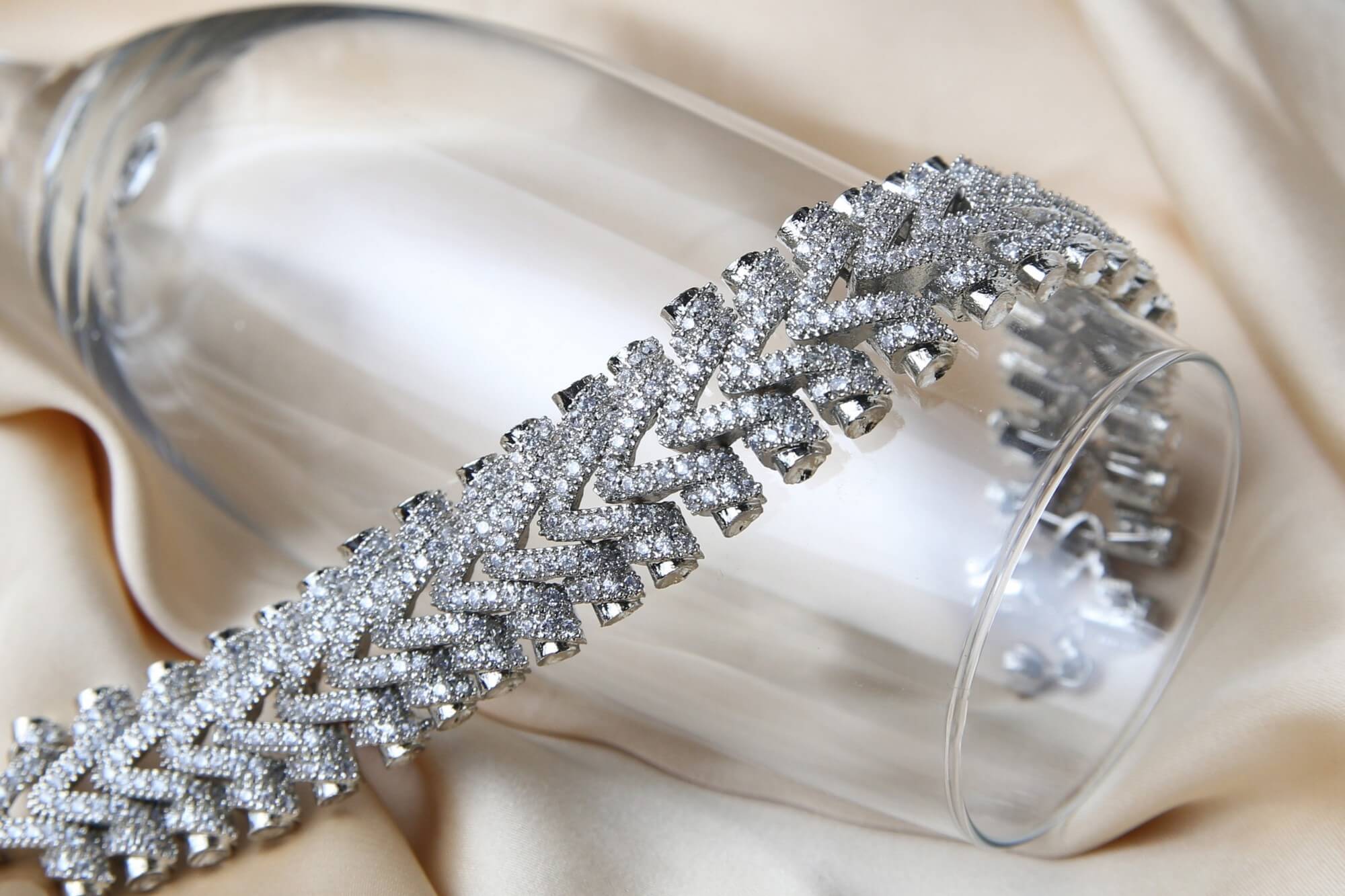 Elevate your elegance with the Lustrous Luxe Bracelet, a breathtaking blend of sophistication and bold luxury. Crafted to perfection, this shimmering masterpiece is designed for those who appreciate refined glamour. This bracelet features an intricate interwoven design, encrusted with a multitude of meticulously set shimmering stones. The striking silver-tone finish enhances its brilliance, ensuring you make a statement with every movement. Whether for an extravagant event, a romantic occasion, or as a luxurious gift, the Lustrous Luxe Bracelet is a true celebration of style.