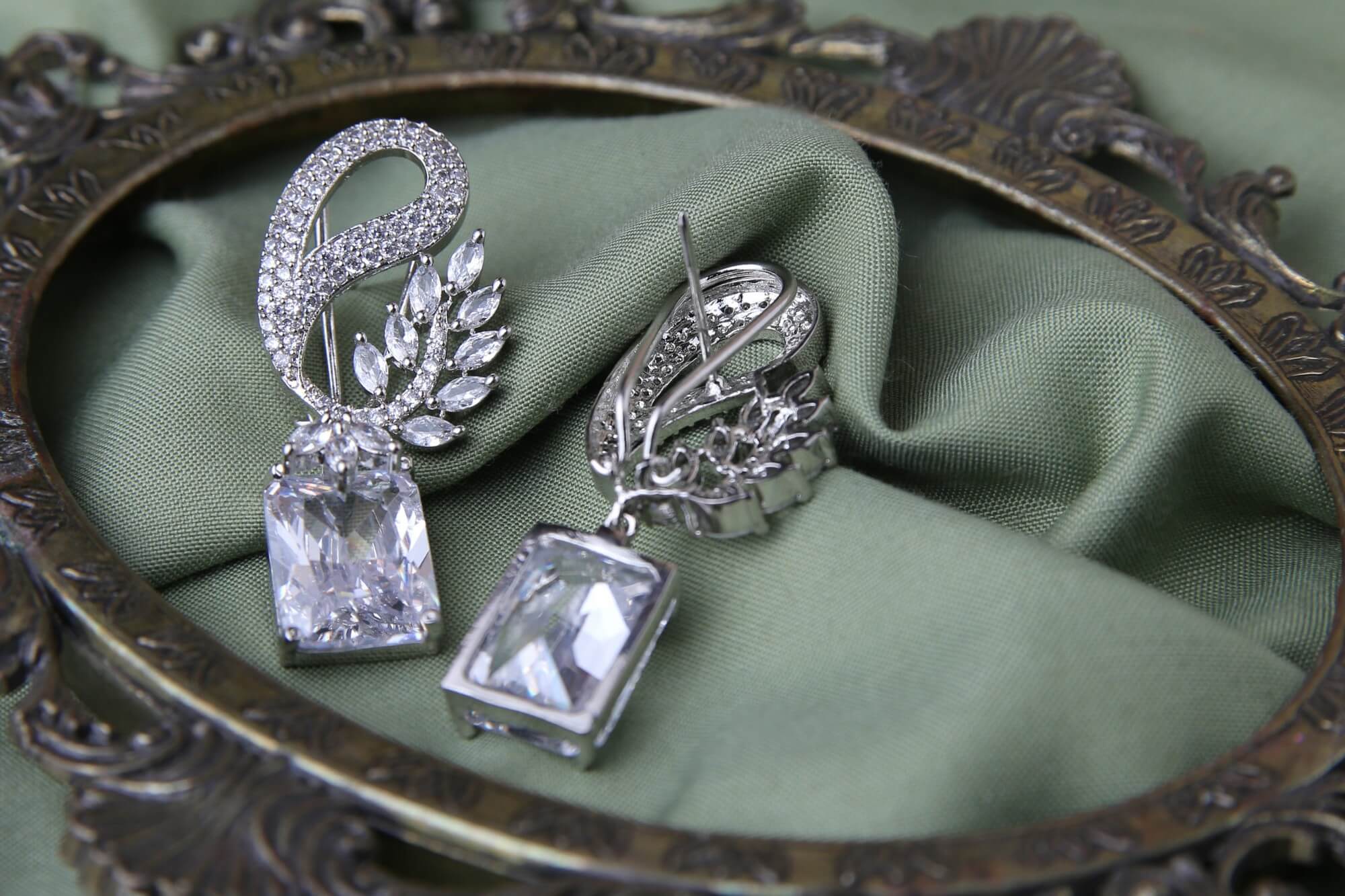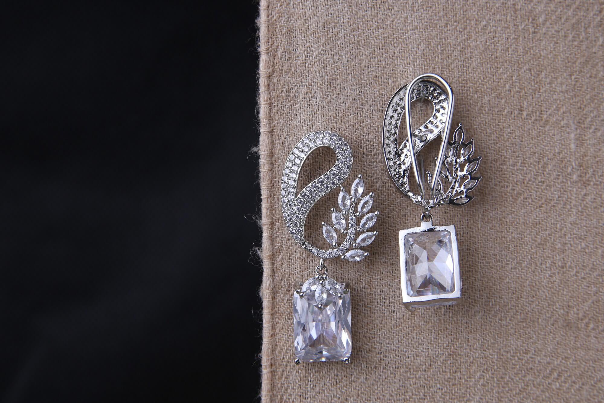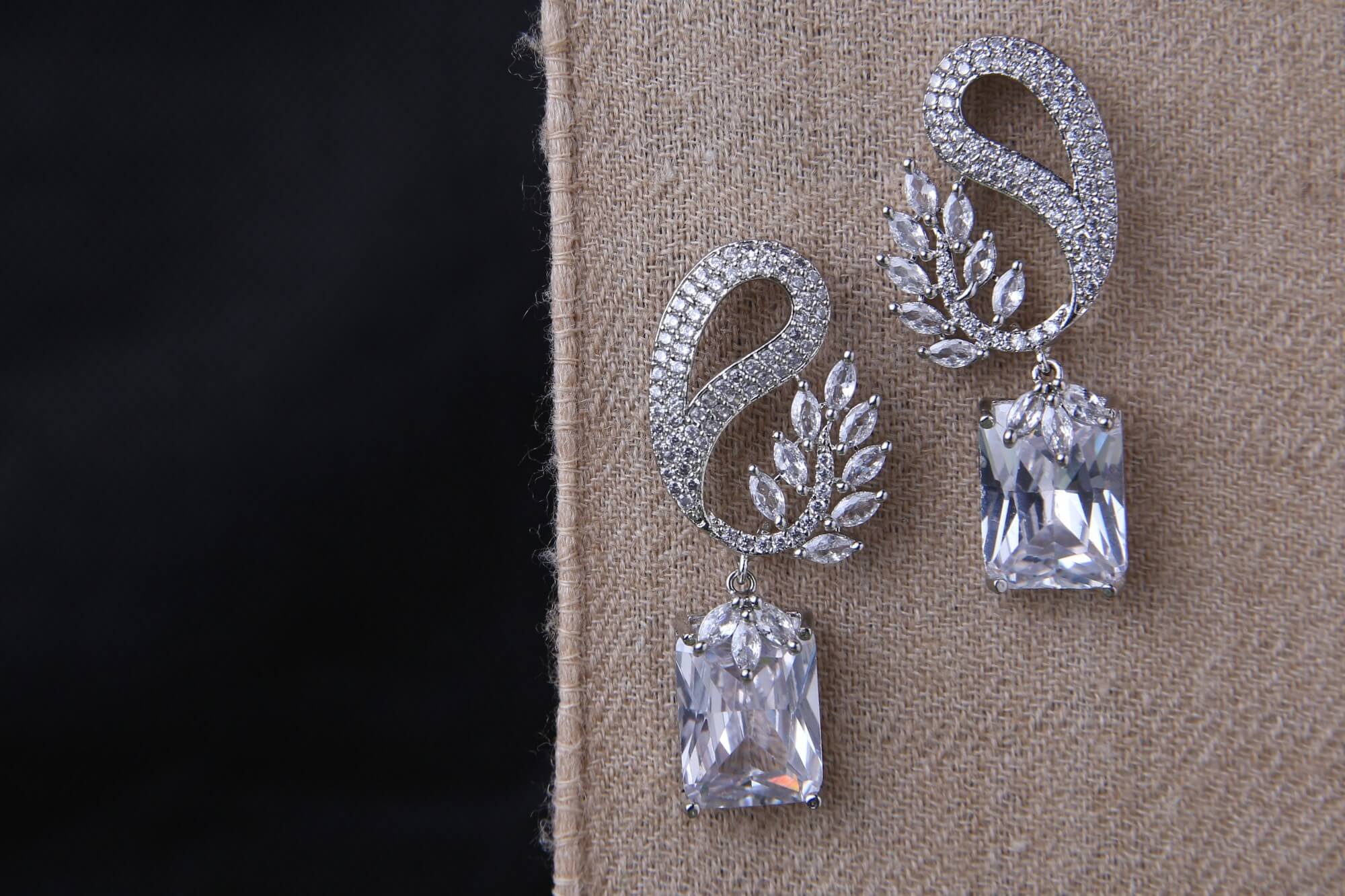 These glamorous earrings feature an elegant swan-inspired design with a pavé-set curved upper section that flows into marquise-cut crystal leaf accents. Each earring is anchored by a stunning rectangular-cut clear crystal pendant. The intricate detailing and high-shine silver-tone finish create a sophisticated statement piece suitable for weddings and galas.