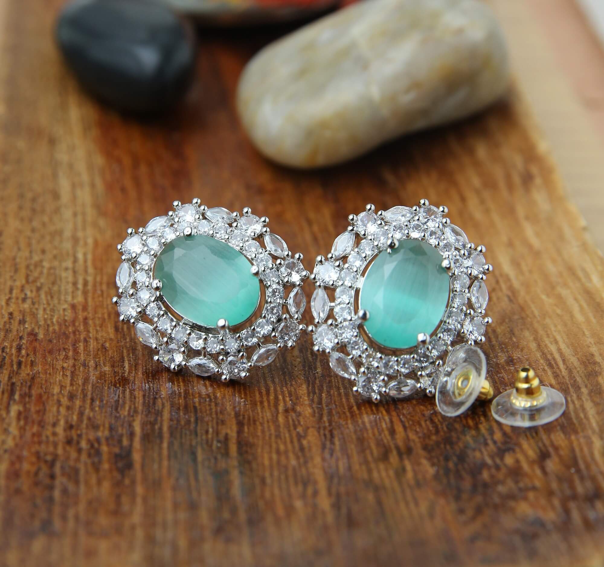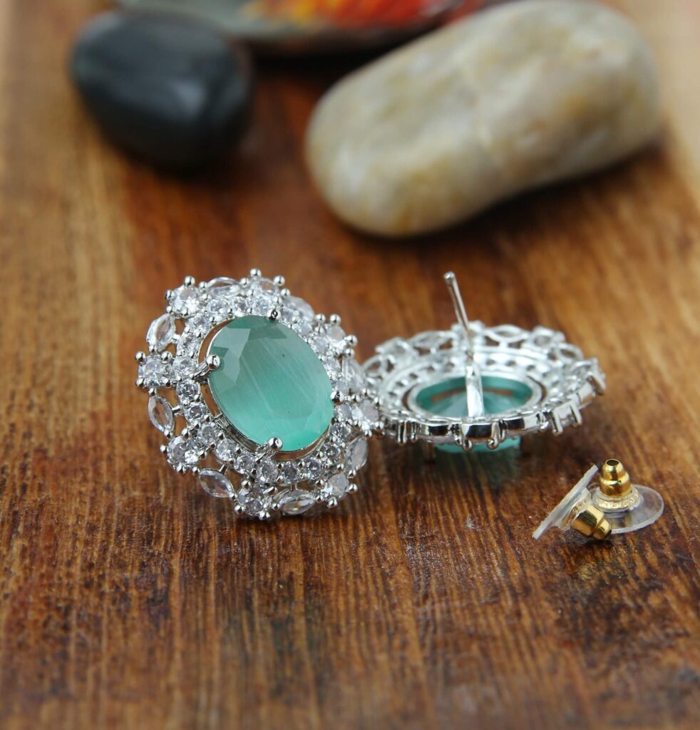 Our Majestic Aqua Gemstone and Crystal Stud Earrings will add refinement to your jewelry collection. These magnificent earrings feature a mesmerizing aqua-colored core that is attractively surrounded by a halo of glittering clear crystals, creating a remarkable contrast that will capture your attention. The vintage-inspired oval design is made of high-quality materials and emanates timeless charm, while the polished silver-tone finish adds sophistication. These earrings are ideal for everyday elegance as well as special occasions, thanks to their comfortable secure back for easy wear. Elevate any ensemble with their brilliant beauty and sparkle with elegance and grace.