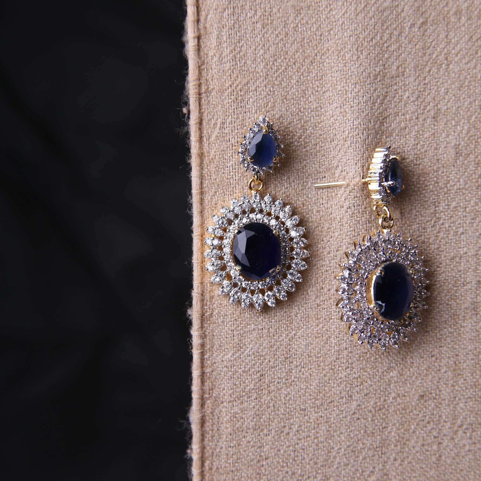 Channel your inner royalty with these breathtaking halo statement earrings. Designed to captivate, each earring features a deep midnight-blue center stone beautifully framed by a radiant halo of sparkling crystals. The delicate teardrop stud flows into an oval centerpiece, creating graceful movement and an eye-catching silhouette. Finished in a lustrous gold-tone setting, these earrings exude luxury and sophistication perfect for evening wear, formal occasions, or adding a touch of glamour to any outfit. A classic yet striking design that never goes out of style.