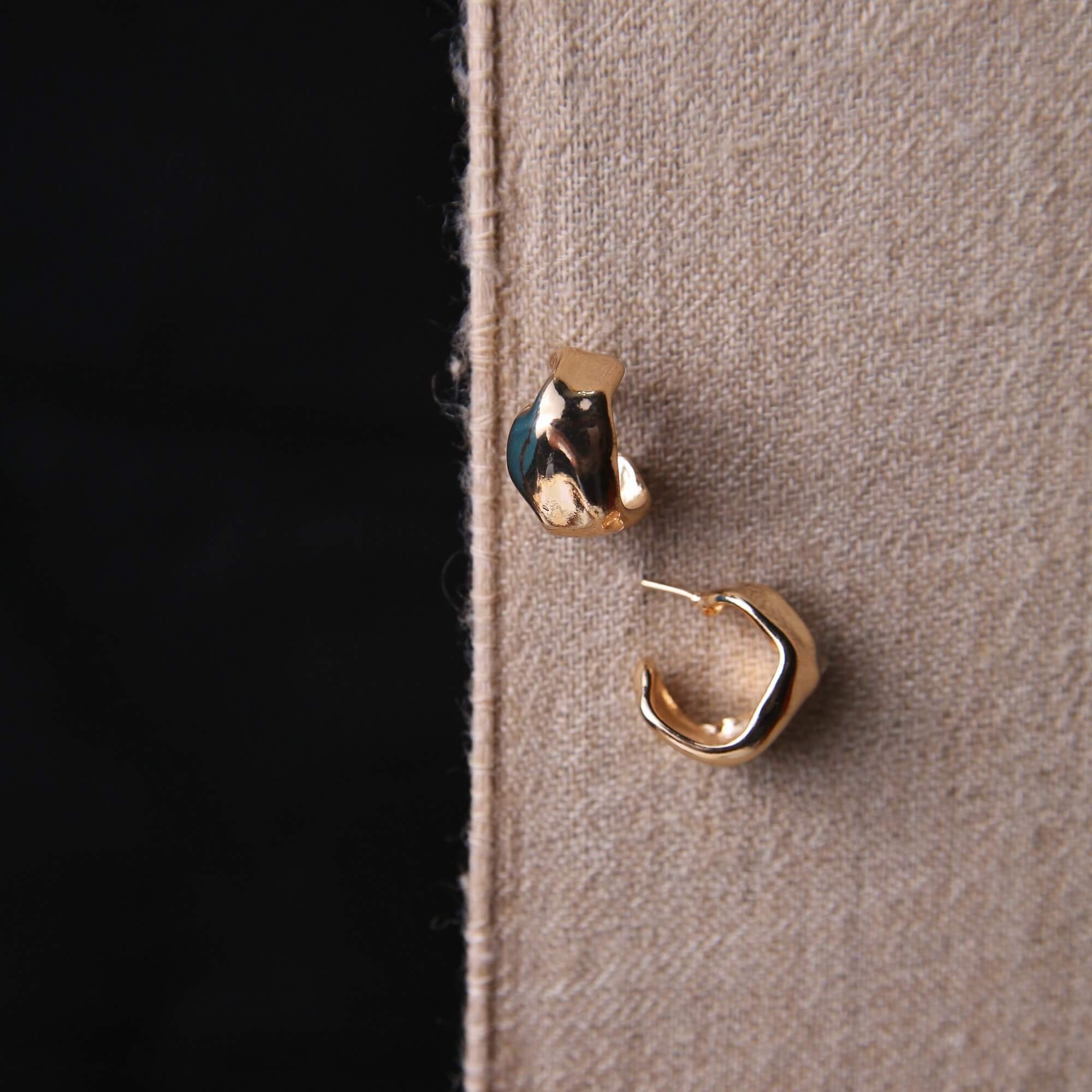 Add a touch of elegance to your jewelry box with these striking geometric hoop earrings. Featuring an organic, molten texture and a radiant high-polish gold-tone finish, these hoops offer a contemporary twist on a classic silhouette. Their irregular, hammered-style surface is designed to play with light and shadow, creating a dynamic glow with every turn of the head. Bold yet sophisticated, these versatile hoops are the perfect statement piece for those who love modern jewelry with a unique, handcrafted feel.
