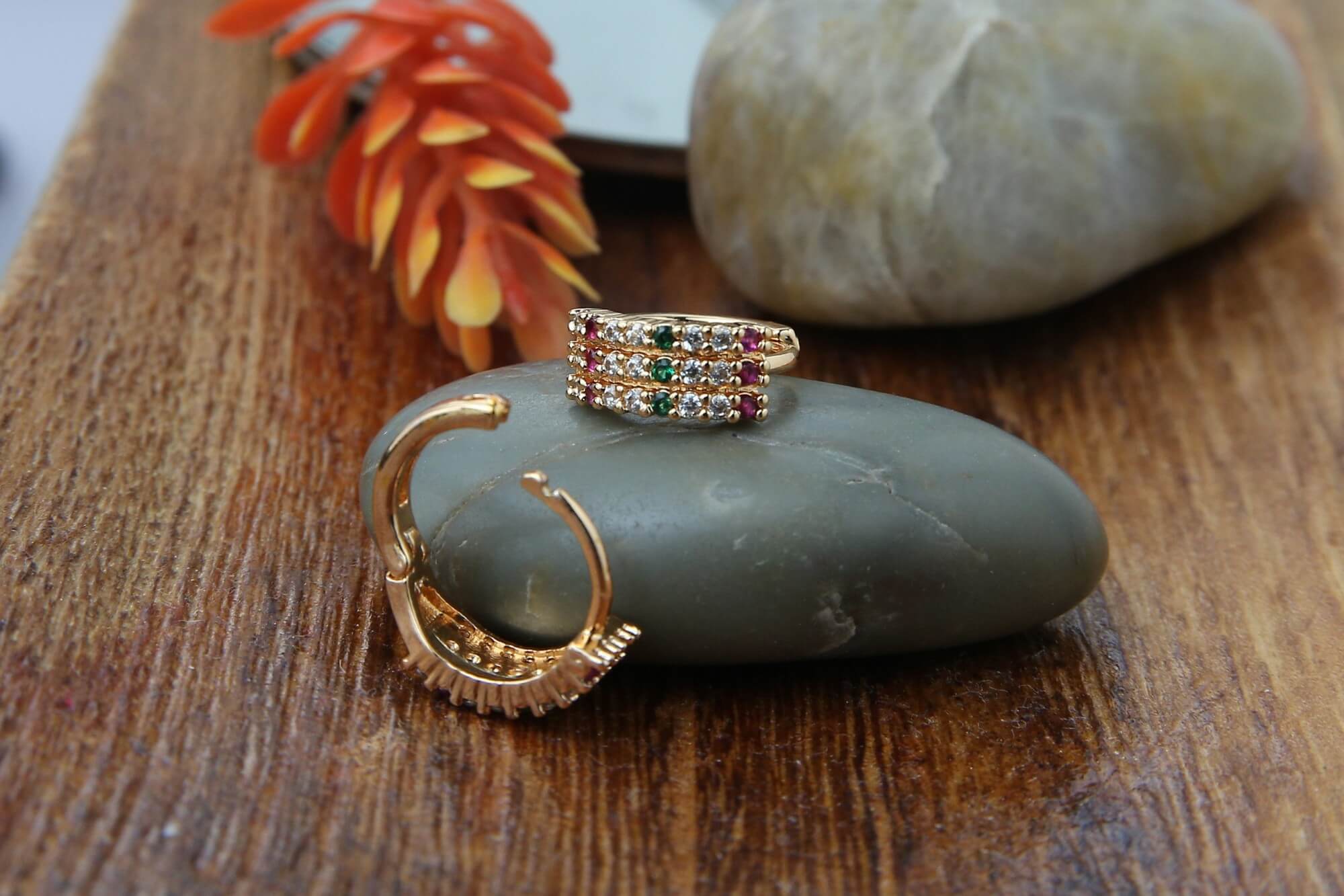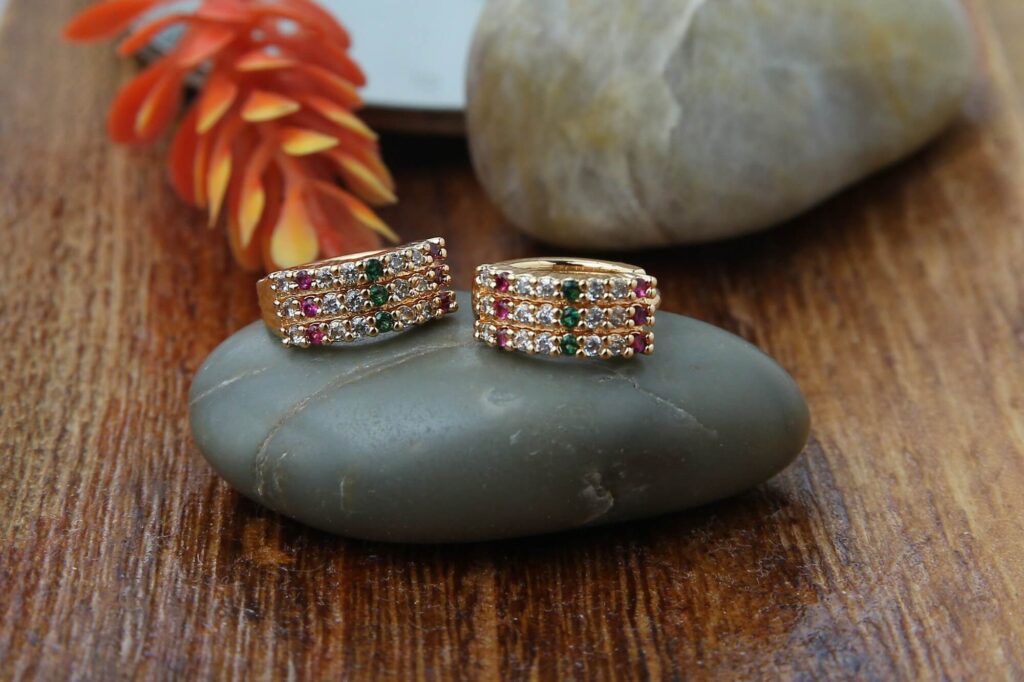Elevate your style with these magnificent multi-colored stacking hoops, which are expertly designed to grab the eye and complement any clothing. These earrings, with their dazzling design and sparkling jewels in vibrant green, pink, and gold hues, elegantly combine elegance with a modern touch. The exquisite arrangement of stones is set against a sleek gold band, creating a sumptuous look while also ensuring longevity. These are excellent for any occasion, from casual outings to formal events, and can be stacked or worn alone. It also features pink, black, golden colors. This wonderful piece of jewelry allows you to embrace your personality while also making a statement.