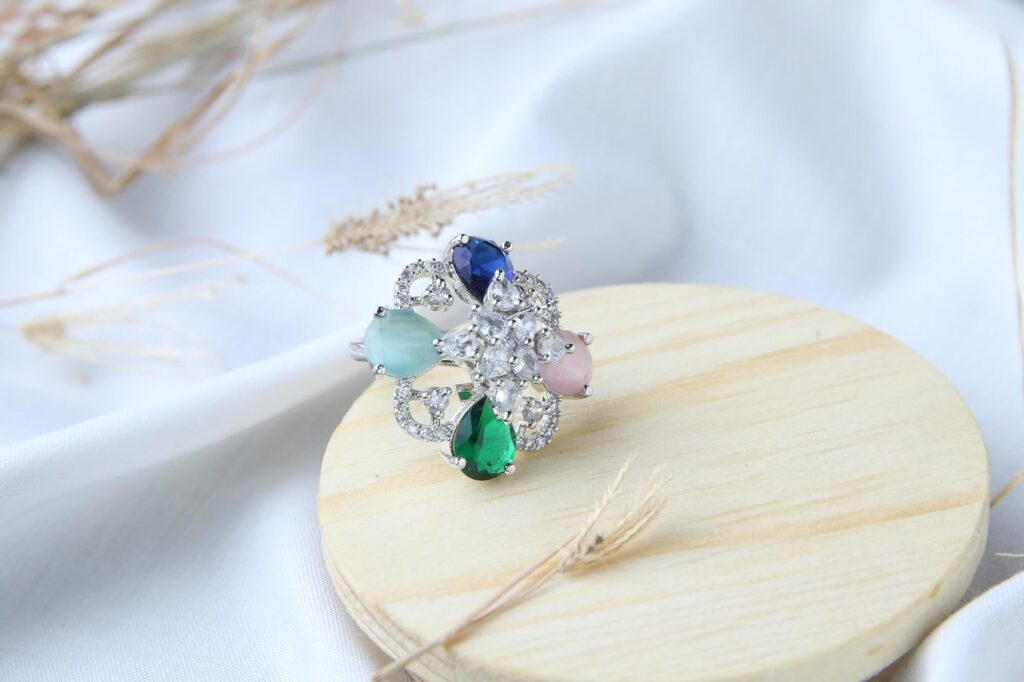 This exquisite floral cluster ring features a stunning arrangement of pear-shaped gemstones in captivating colors—deep blue sapphire, soft mint aquamarine, delicate pink rose quartz, and rich emerald green. The blooming design is beautifully centered with brilliant clear stones, all set in a sophisticated silver-tone setting. Perfect for adding a pop of color to any outfit, this statement piece celebrates natural beauty with its garden-inspired elegance.