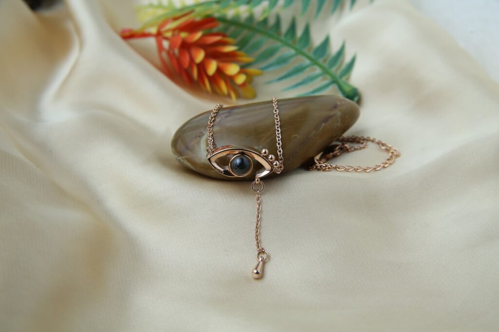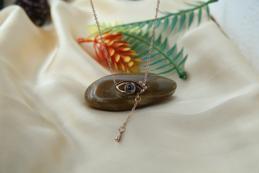 This unique necklace features a rose gold chain adorned with a captivating eye pendant. The eye is crafted with a dark, mesmerizing stone that appears to be set within a delicate frame. A smaller stone hangs from a chain attached to the eye, adding a touch of intrigue and sophistication.