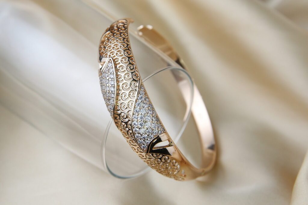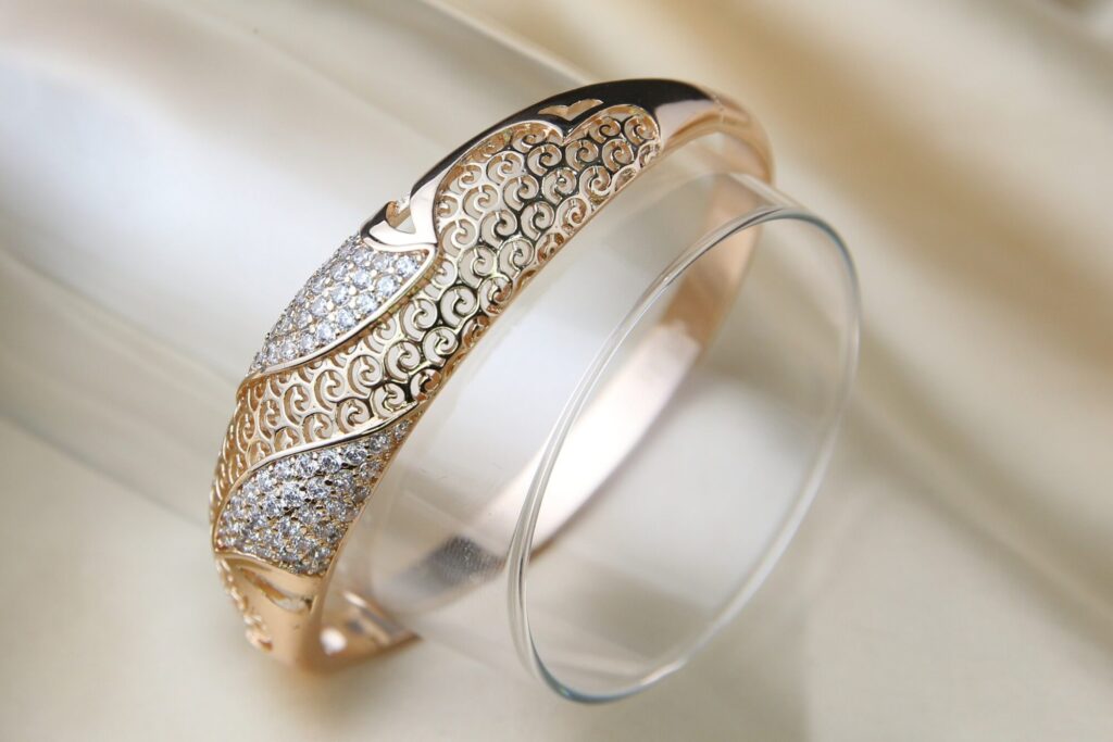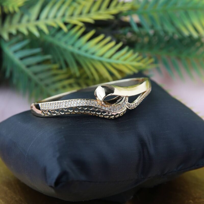 Indulge in timeless elegance with this stunning gold-plated bracelet, featuring an intricate filigree design that exudes sophistication. Adorned with dazzling stones set in a flowing wave pattern, this piece beautifully balances classic artistry with modern glamour. The delicate sturdy craftsmanship ensures a comfortable fit, making it perfect for special occasions or adding a luxurious touch to everyday wear. A statement accessory that radiates charm, this bracelet is an exquisite addition to any jewelry collection.
