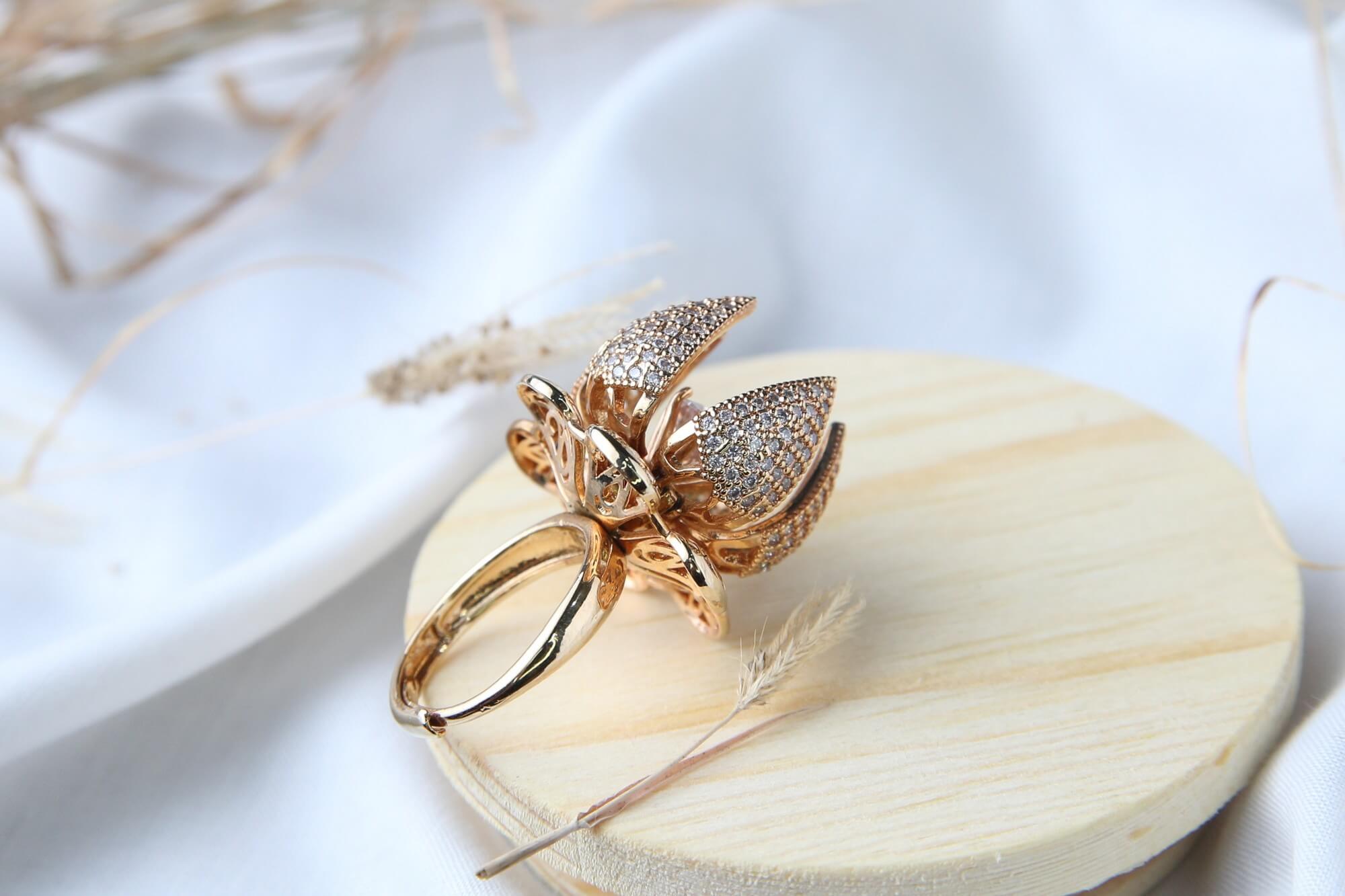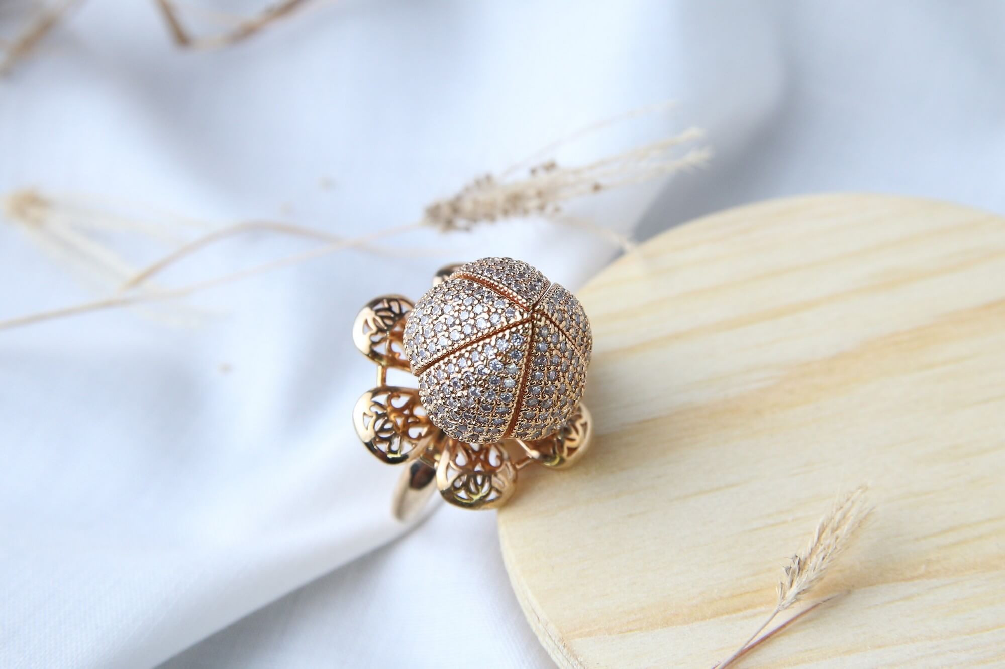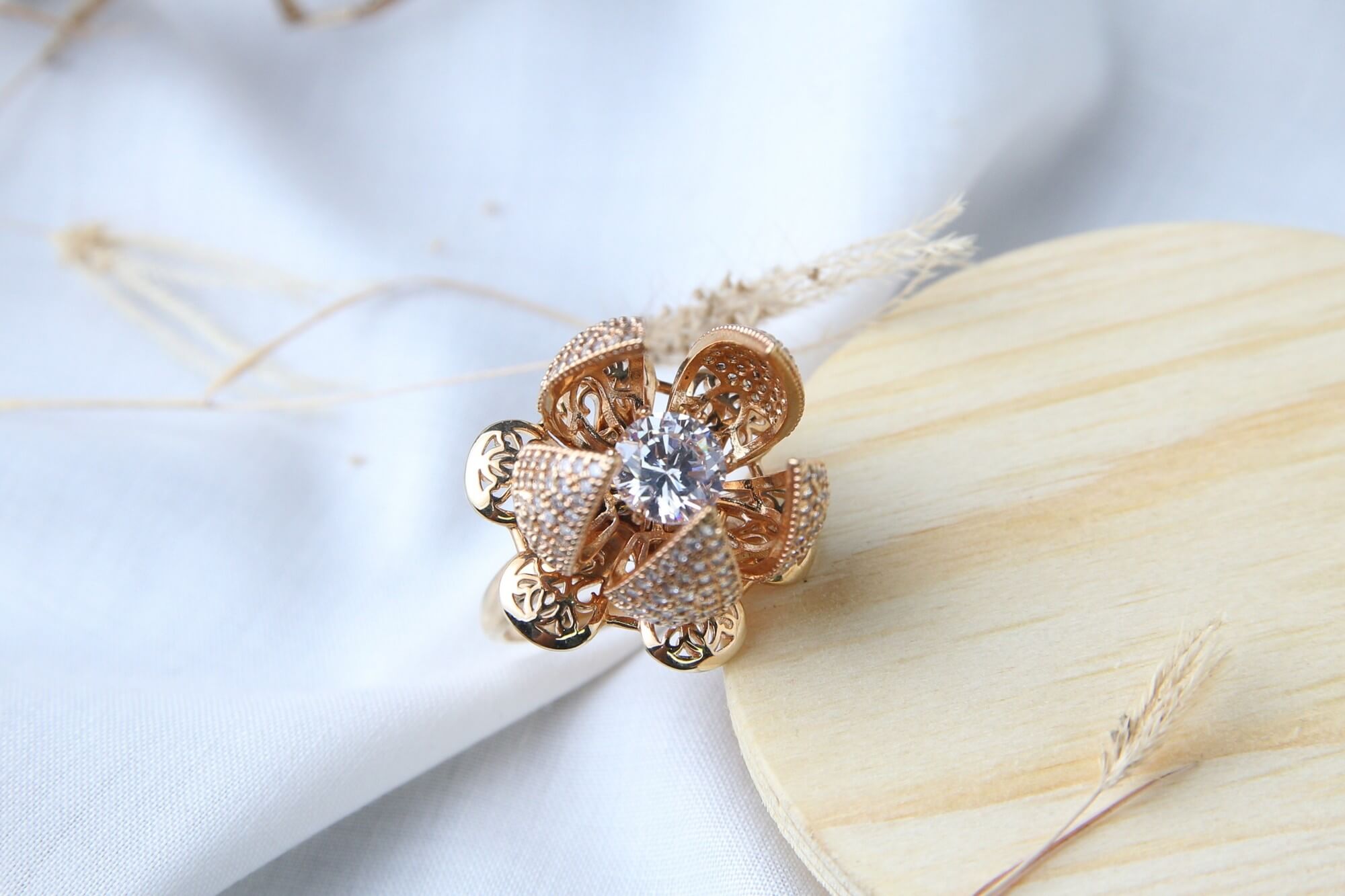 This exquisite gold ring features a transformable design that opens like a blooming flower. When closed, it appears as a diamond-encrusted dome with delicate gold detailing. When opened, it reveals a stunning center diamond surrounded by diamond-studded petals with intricate filigree work. The convertible nature of this ring offers two distinct looks in one remarkable piece, combining sophisticated craftsmanship with dazzling brilliance.