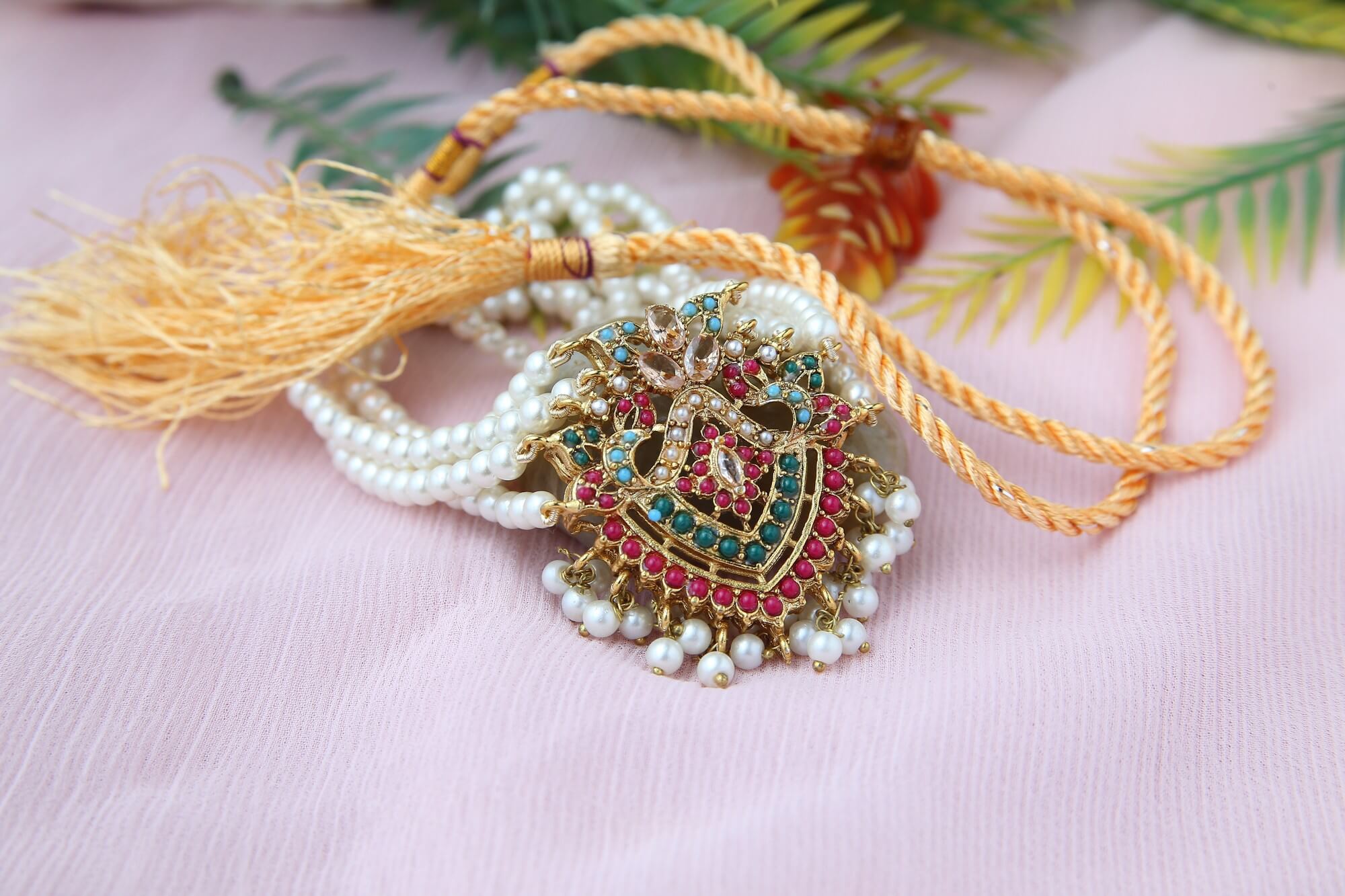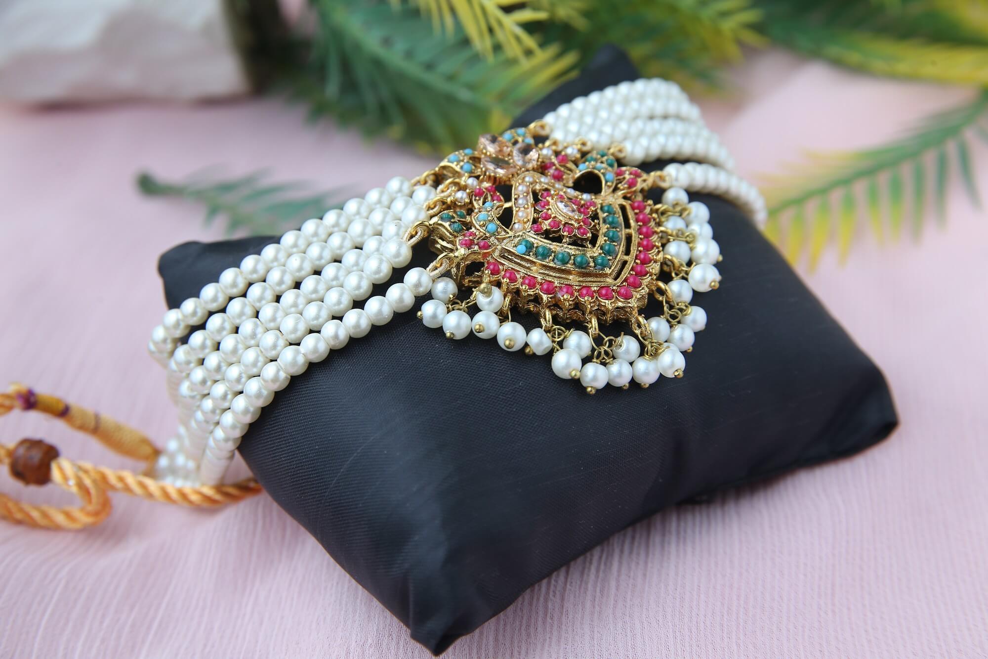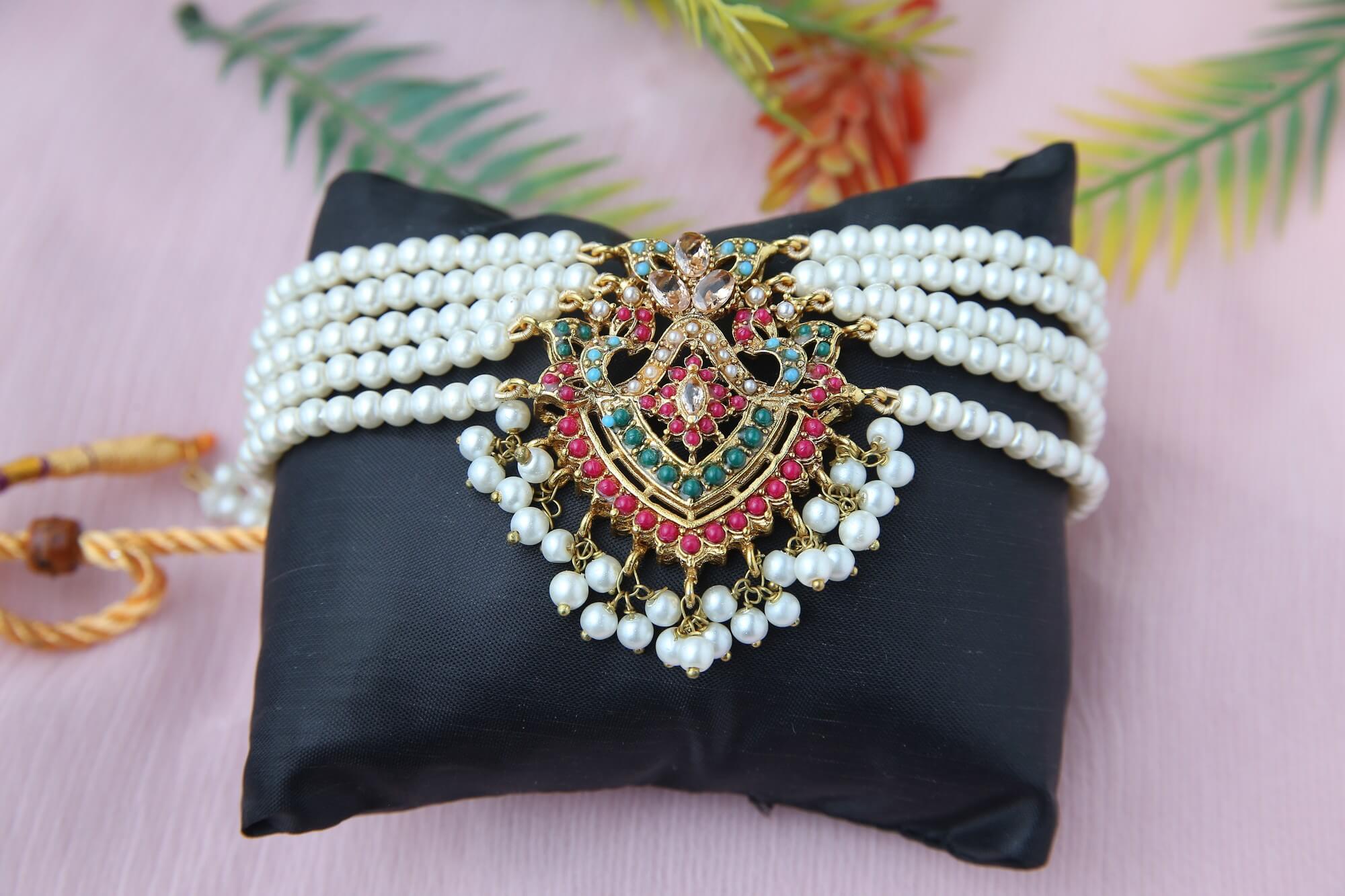 This gorgeous choker set is a gorgeous fusion of contemporary and classic style. The exquisite jadau work with multicolored jewels offers a pop of color, while the delicate pearls create a timeless beauty. A real masterpiece, the focal pendant is embellished with beautiful stones and a flowery pattern. The pair is ideal for both daily wear and special occasions thanks to the matching earrings.