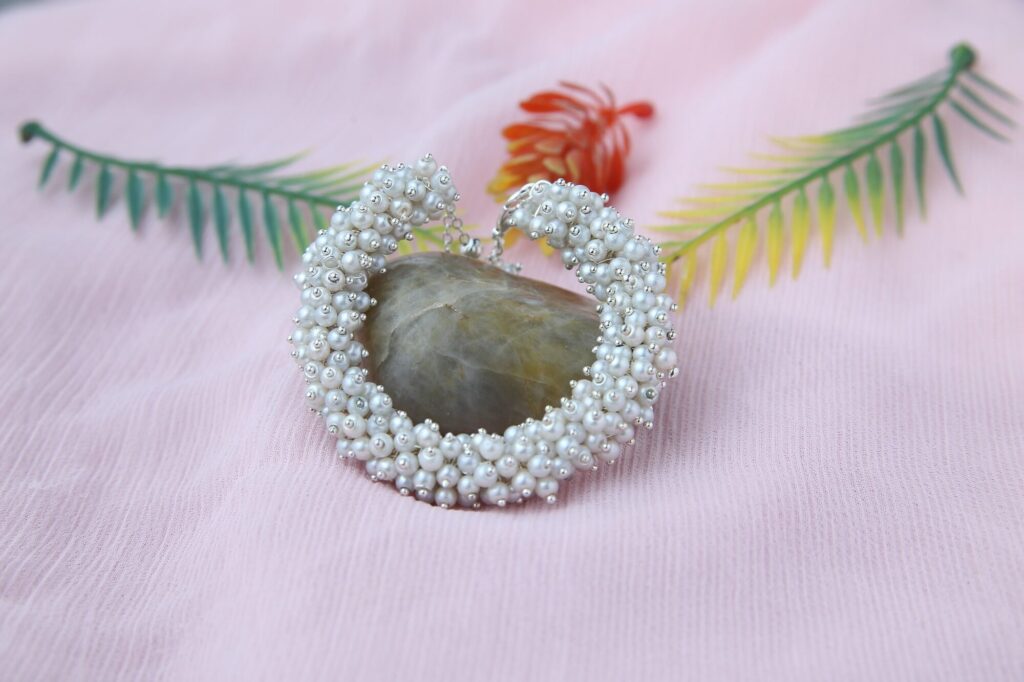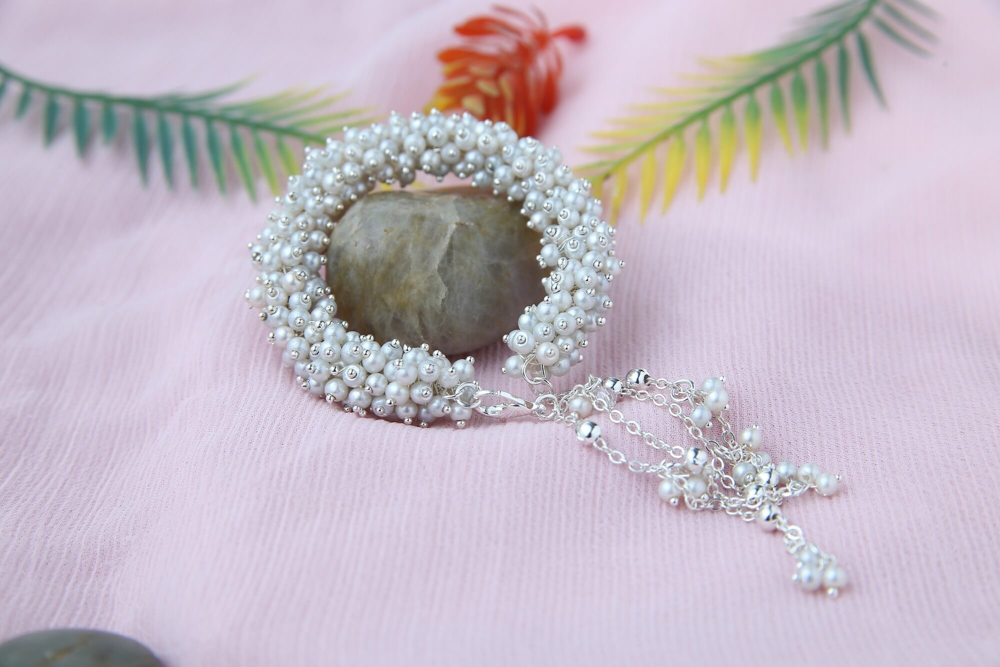 This jewelry made with beautiful pearls oozes beauty and sophistication. The distinctive spiral pattern gives a dash of modern flair. The bracelet features a delicate chain with multiple dangling pearl charms. This unique design adds a touch of movement and dimension to the piece, creating a captivating and eye-catching effect. The chain is securely attached to the bracelet, ensuring long-term wear.