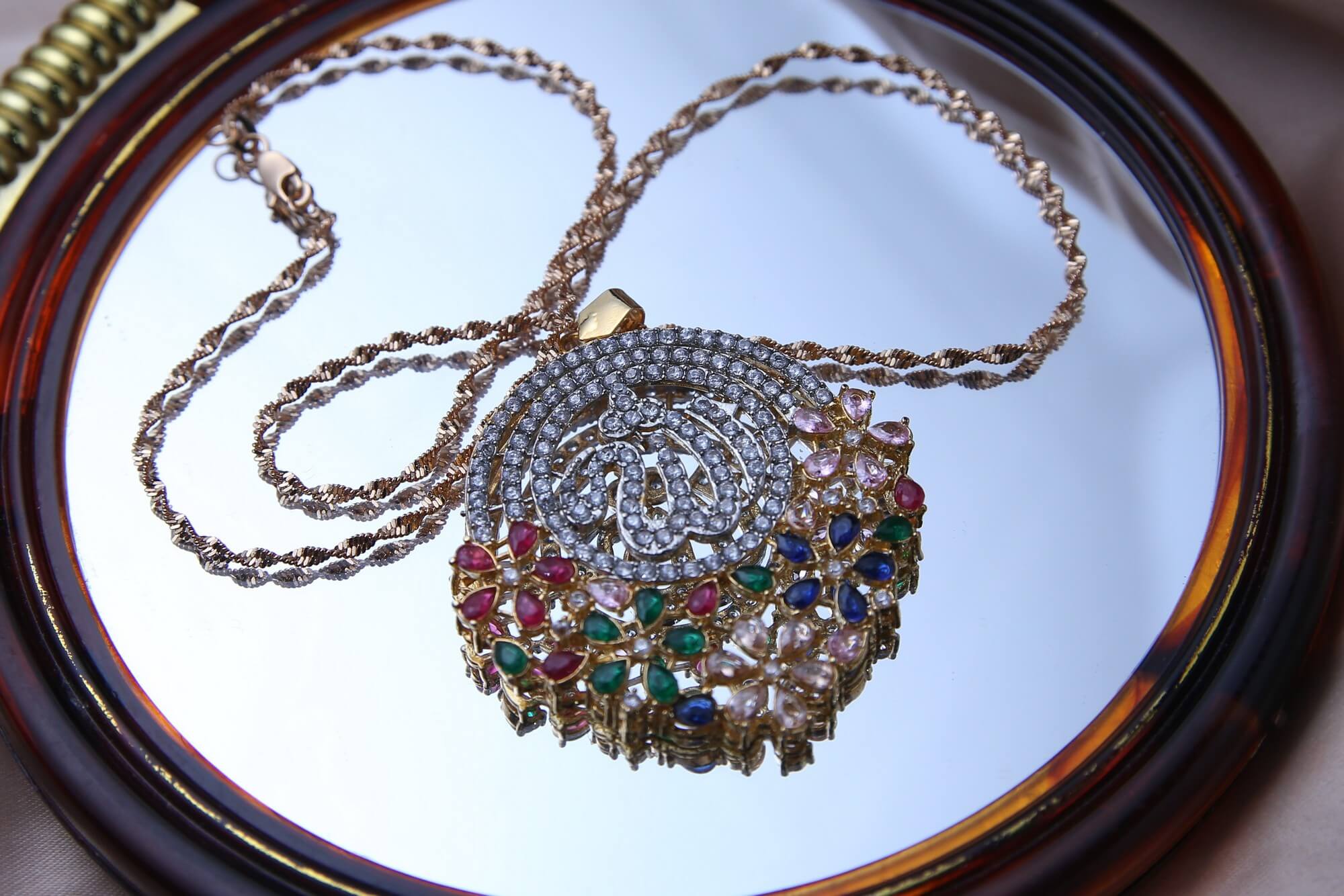 The essence of classic beauty is encapsulated in this captivating pendant. Its slender gold chain gracefully displays a gorgeous mélange of multicolored gemstones, encircled by glittering diamonds and including vivid rubies, emeralds, and sapphires. Its elaborate design, which honors traditional workmanship, makes it the ideal statement piece for any setting. This pendant is a celebration of grace and ancestry in addition to being a piece of jewelry.