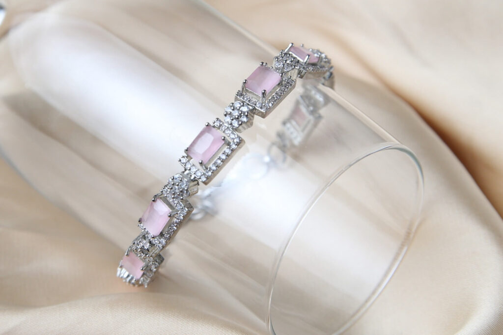 Adorn your wrist with this masterpiece of sophistication and grace, the Ethereal Elegance Bracelet features soft pink quartz gemstones framed by dazzling diamond-like accents, all set in a radiant silver finish. Each emerald-cut pink quartz stone is embraced by a halo of shimmering crystals, creating a look that is both luxurious and ethereal. The bracelet’s floral-inspired connectors add a unique charm, making it an exquisite statement piece. Whether for a special occasion, an anniversary, or a heartfelt gift, this Bracelet is a symbol of refined beauty that will be treasured forever.