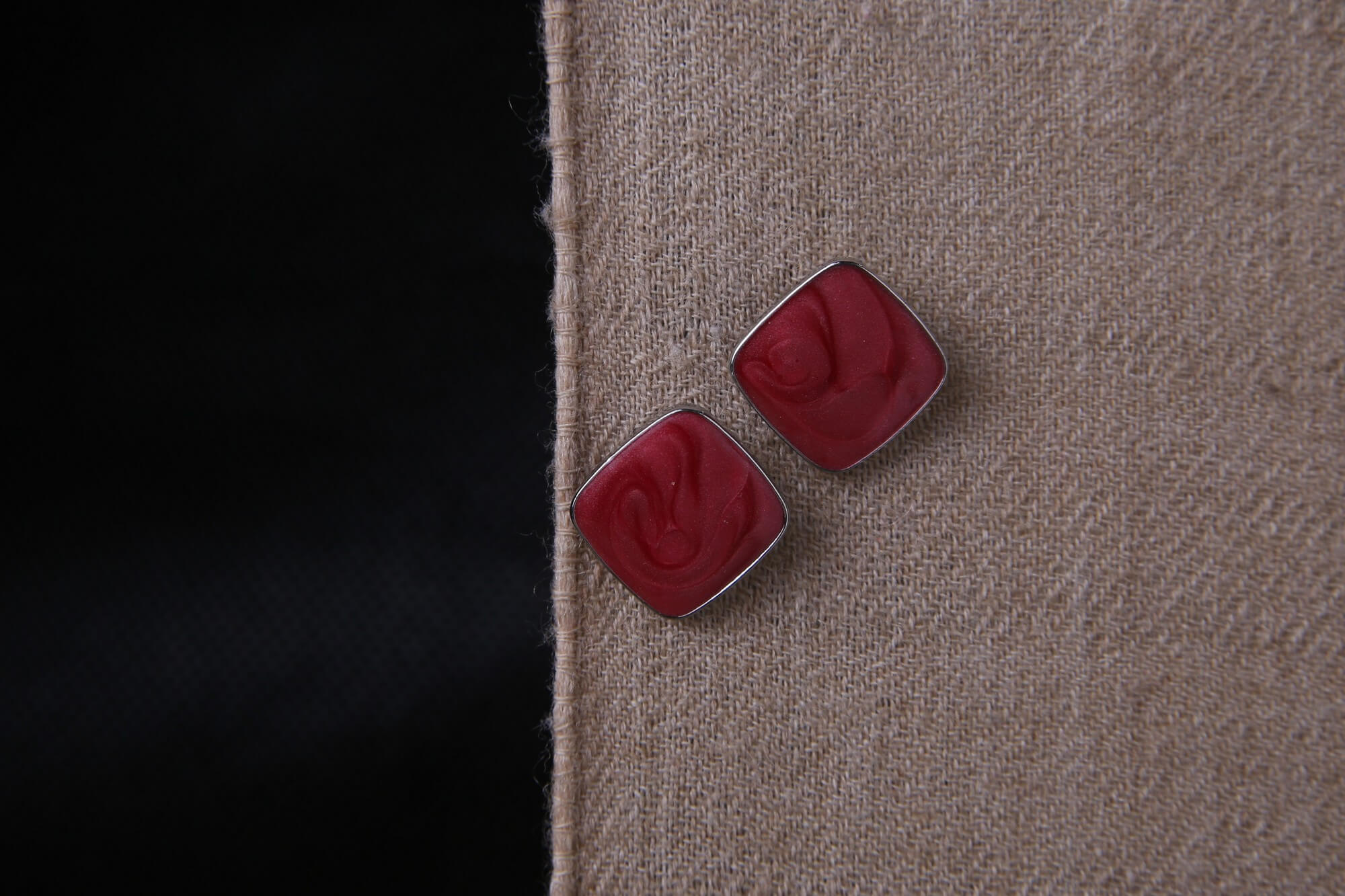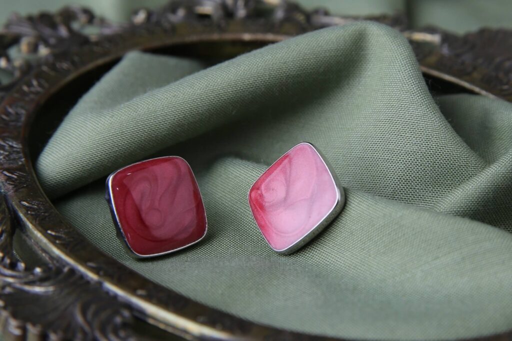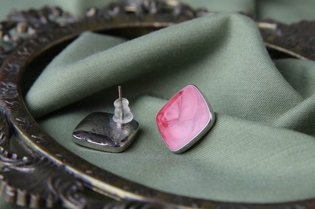 These sophisticated square-shaped earrings showcase pink gemstones, likely pink opal with a marbled appearance. The smooth, polished stones are set in silver bezels with clean, modern lines. The soft pink hue and contemporary design make these versatile for both casual and dressy settings.