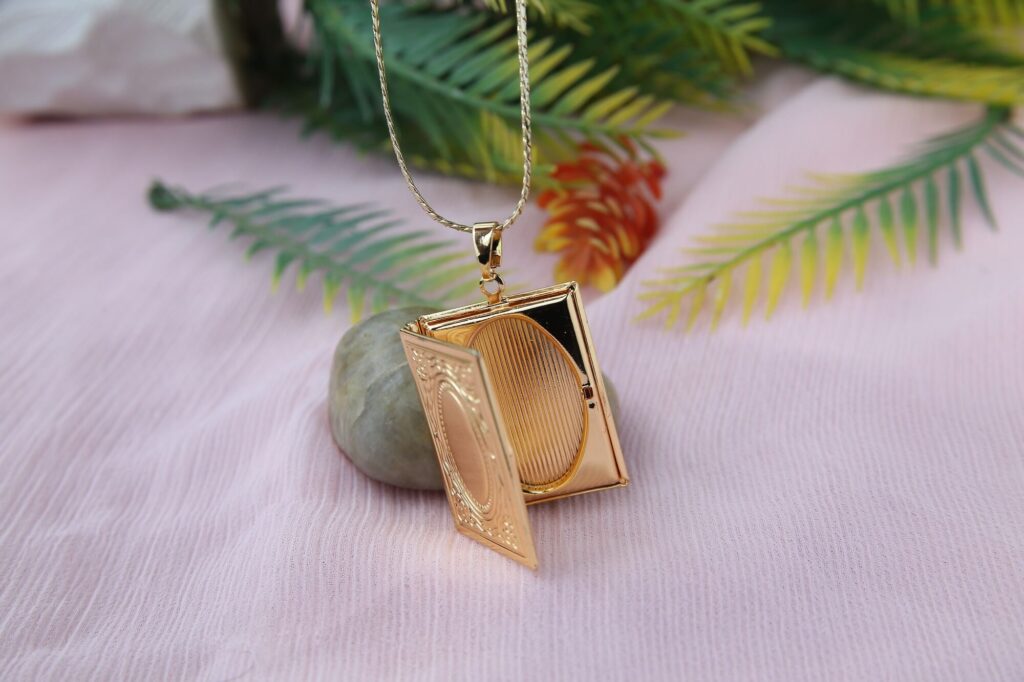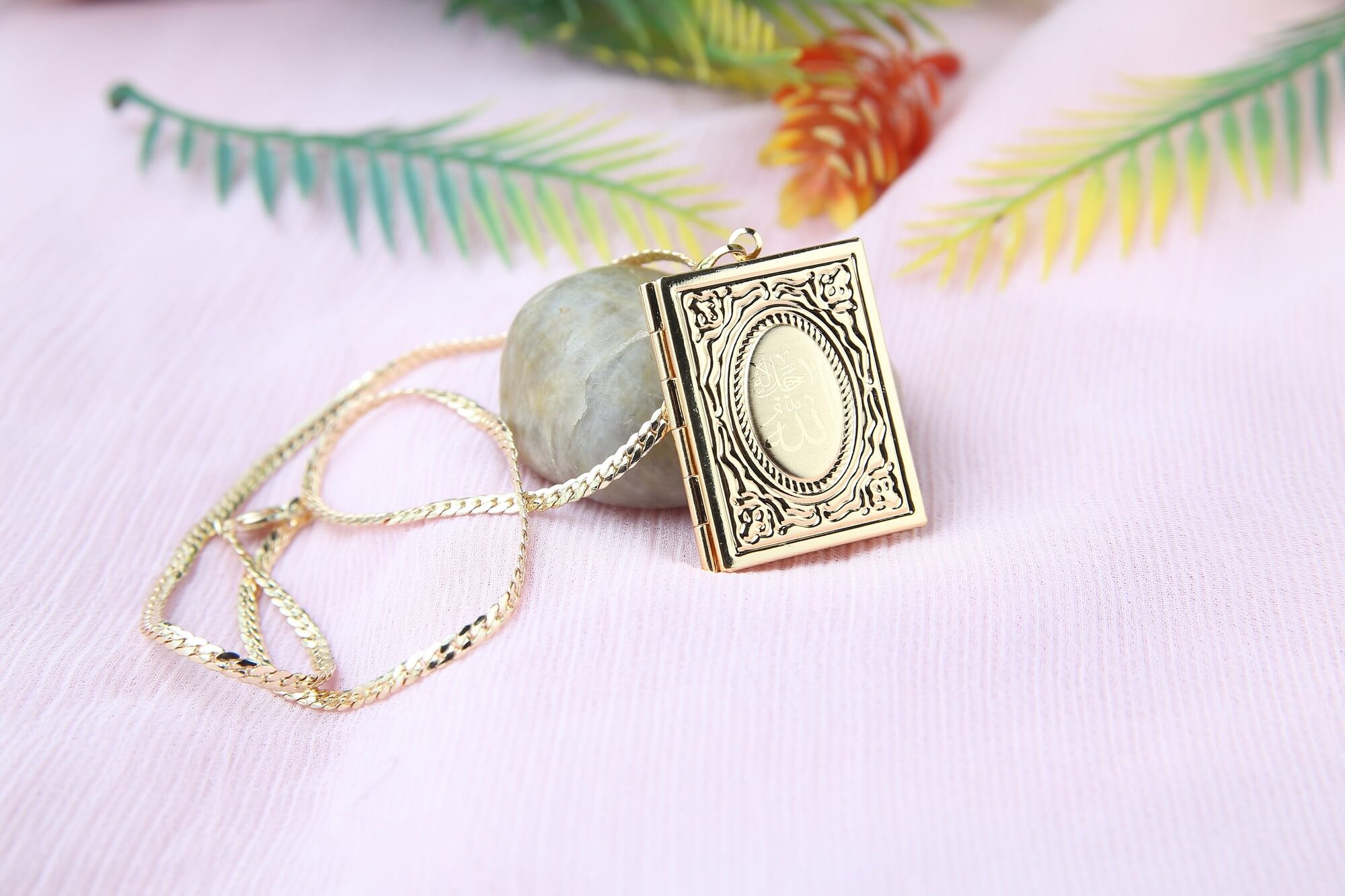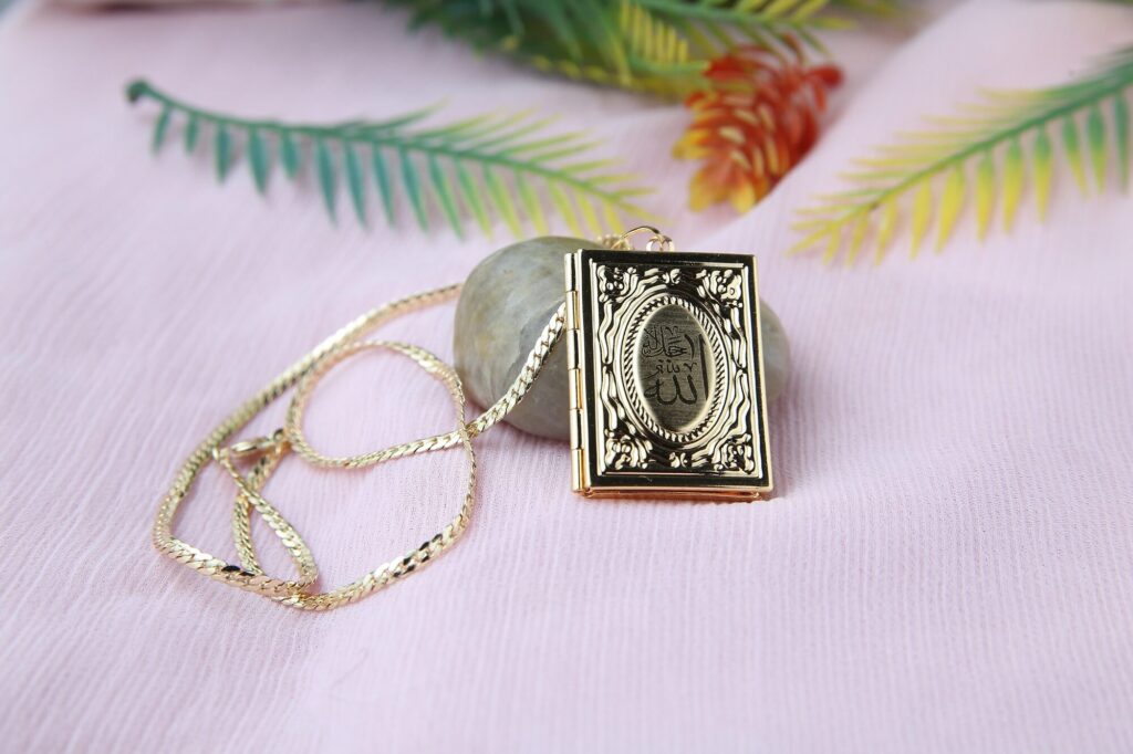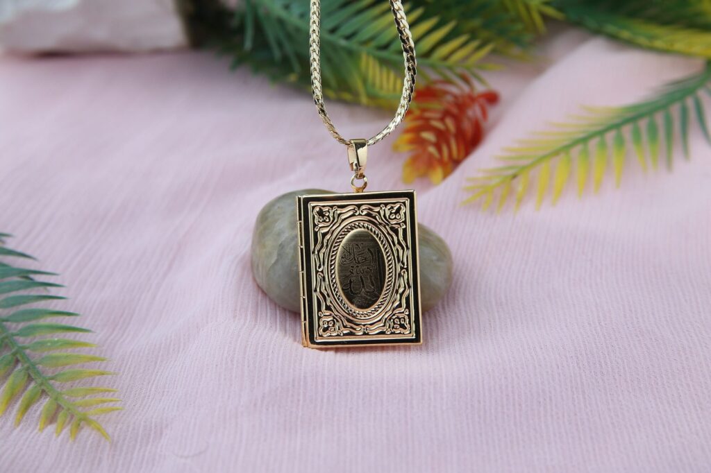 A delicate necklace with a gold plating and a little, rectangular pendant with beautiful Islamic calligraphy on it. The necklace is placed inside a pretty frame and looks like a tiny Quran. The necklace’s elegance and adaptability are enhanced by the chain, a delicate snake chain.