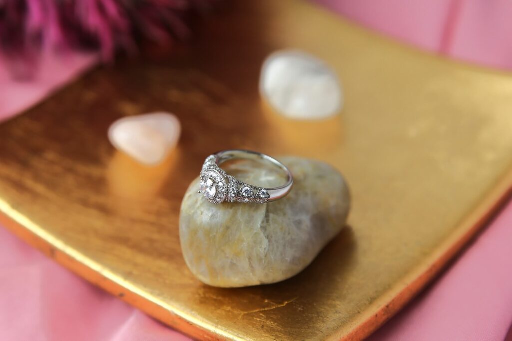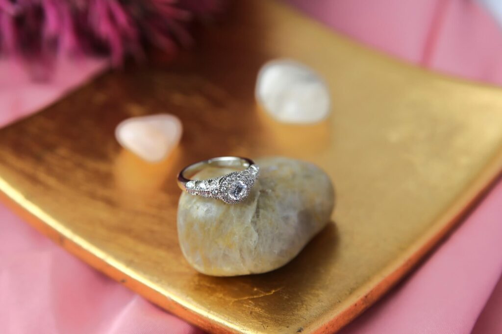 This stunning ring features a brilliant center diamond that is expertly set in a finely wrought silver band with elaborate floral motifs. The ring’s elegance and attractiveness are accentuated by the polished, flat surface it sits on. The ring is the ideal representation of joy and love because of the delicate pink background that accentuates its brilliance.