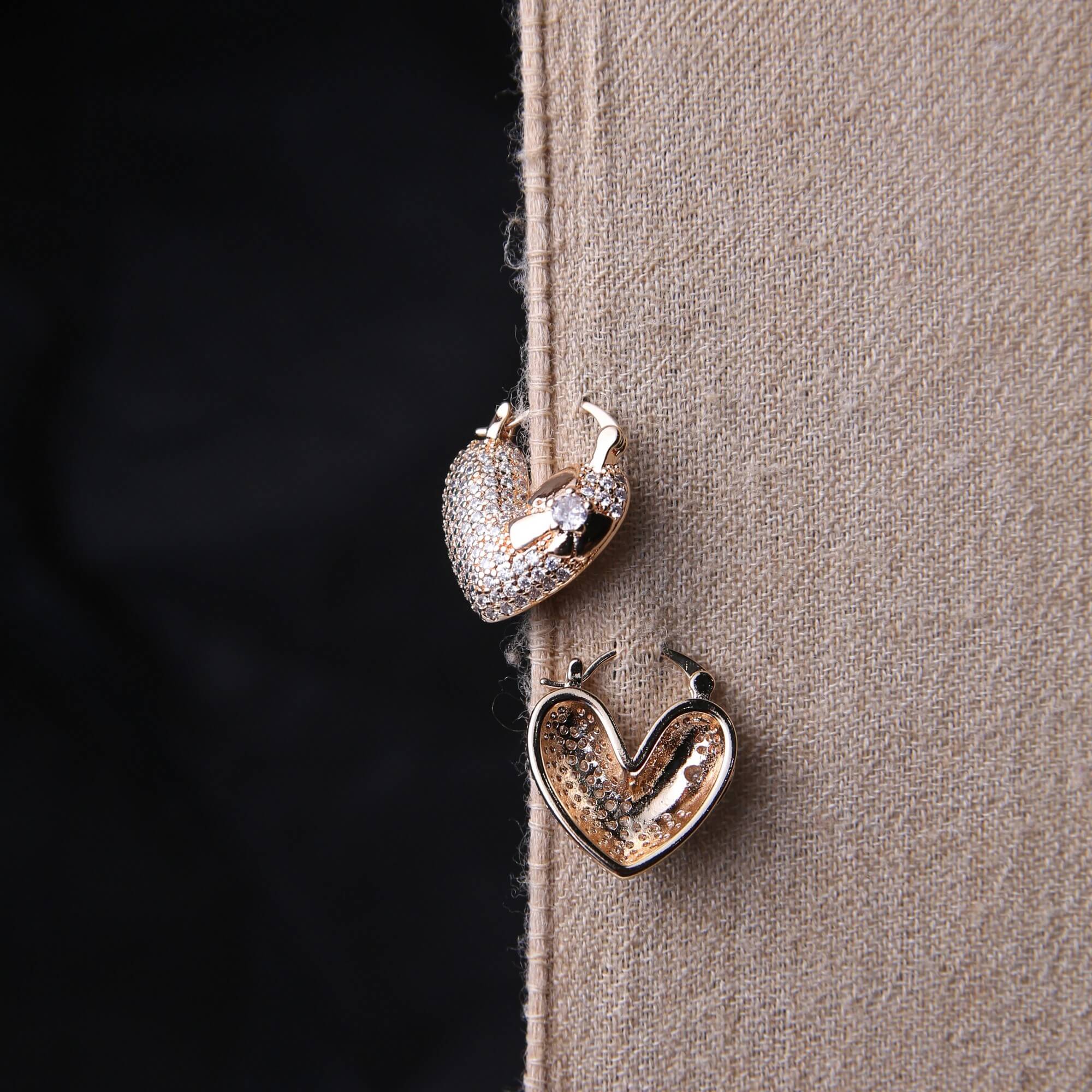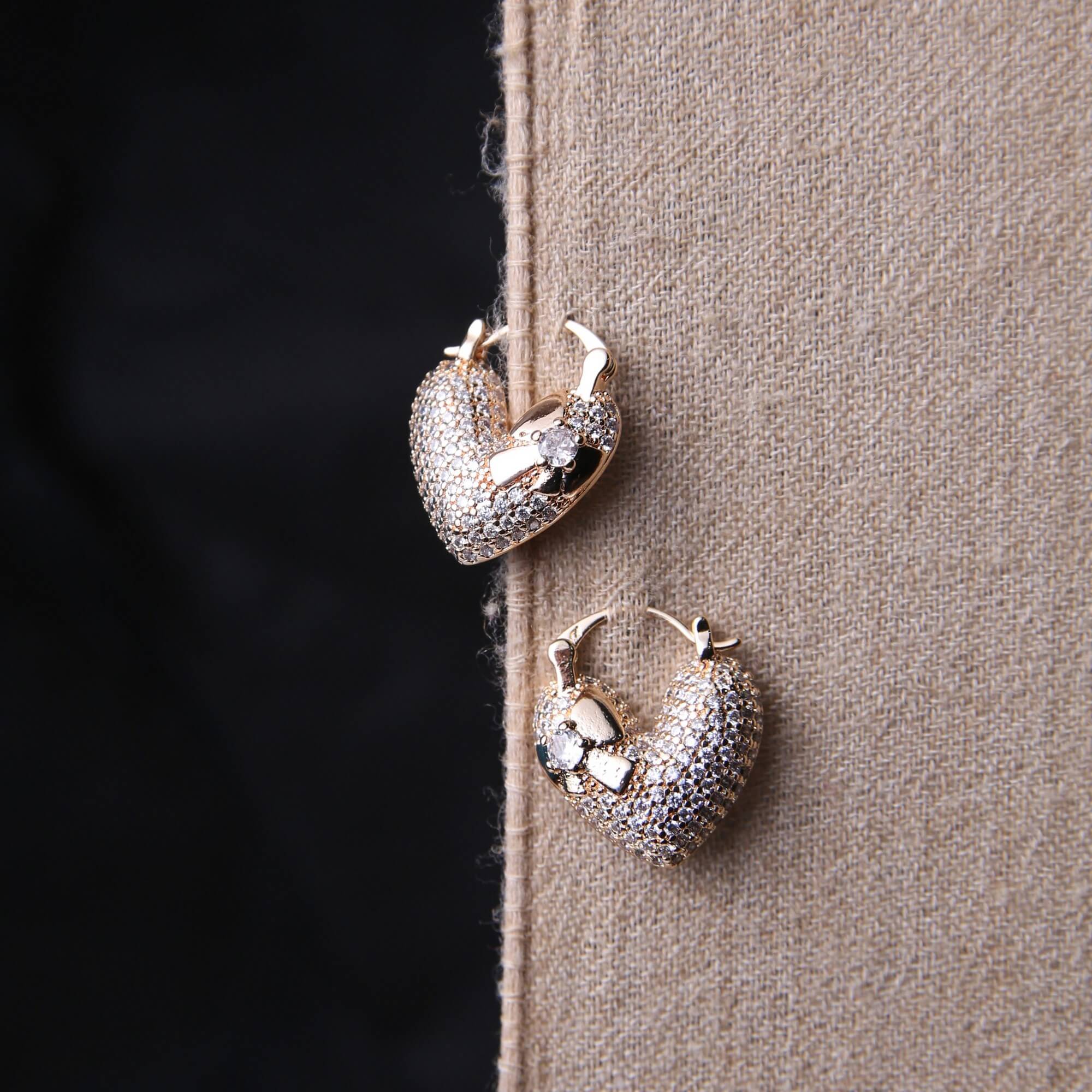 Embrace a romantic and luxurious aesthetic with these stunning heart-shaped hoop earrings. Each piece is meticulously encrusted with shimmering brilliant zircon stones, designed to catch the light from every angle with a diamond-like glow. The unique heart silhouette offers a modern, high-fashion twist on the classic hoop, creating a look that is both sweet and sophisticated. Crafted with a warm, radiant gold-tone finish, these earrings provide a rich contrast to the sparkling stones, making them the perfect statement accessory for a romantic evening or a dazzling gift for someone special.