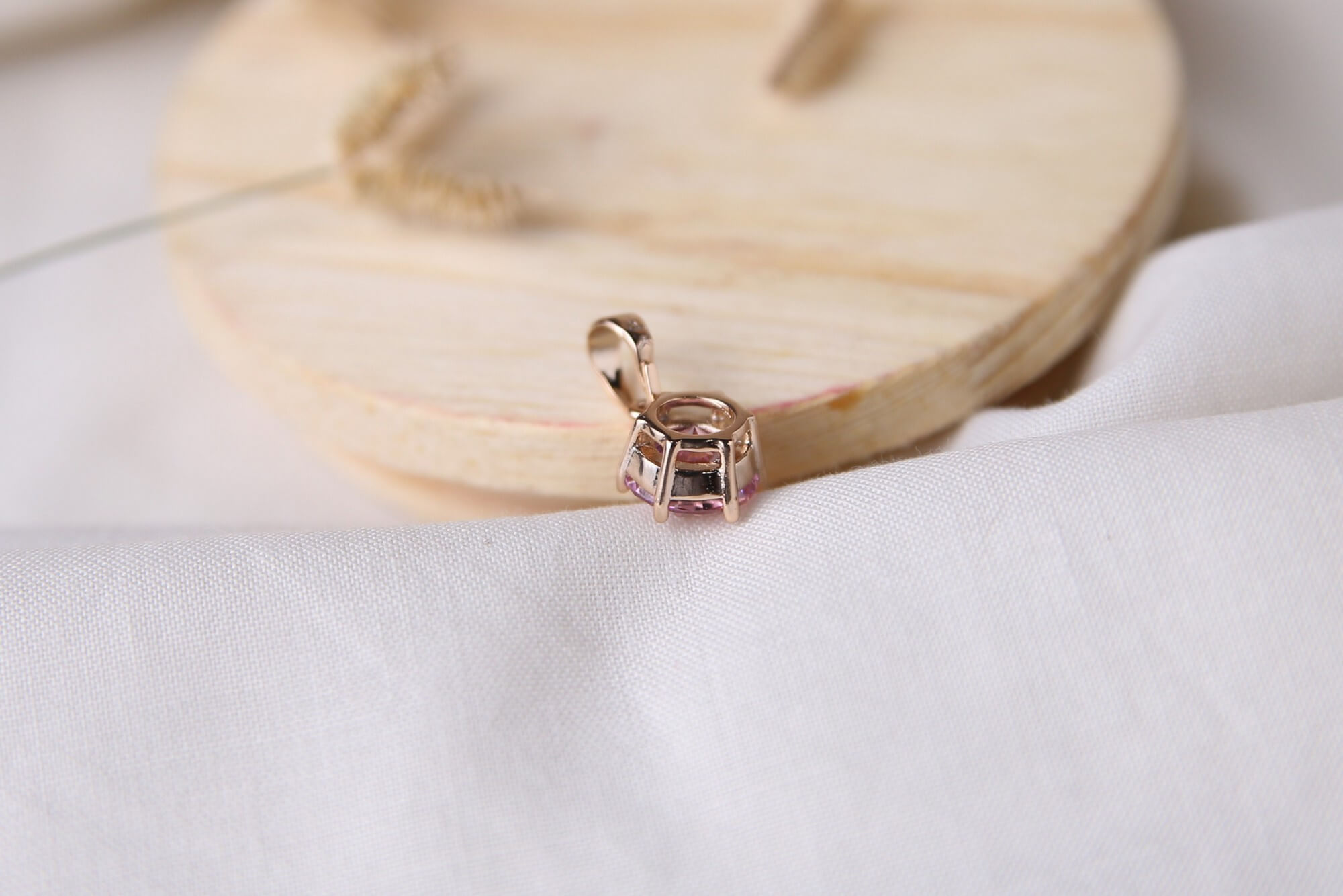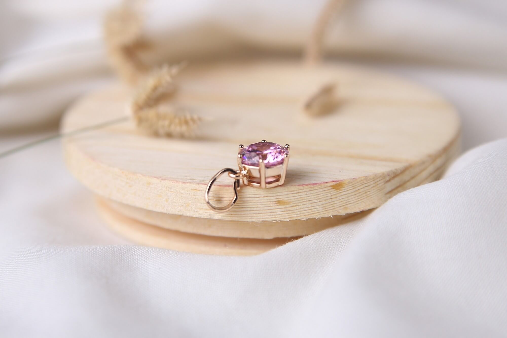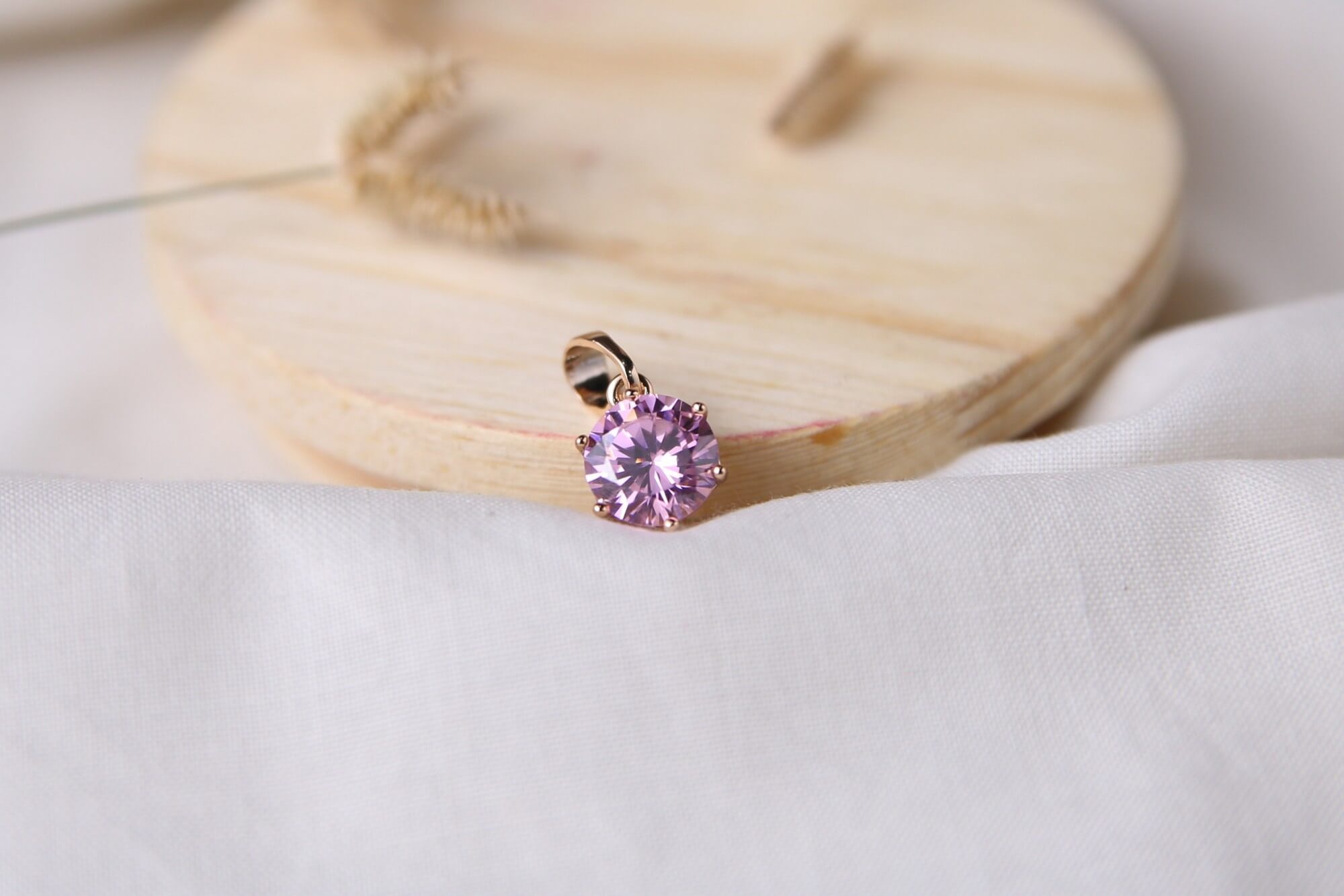 Infuse your jewelry collection with a soft, feminine glow with this elegant round-cut solitaire pendant. This piece features a brilliant lavender stone that captures the delicate color of spring blooms. The central gem is secured in a classic setting. Crafted with a warm rose gold-tone finish, the metal’s rosy hue perfectly complements the lilac stone, creating a romantic and sophisticated aesthetic. Its timeless, minimalist design makes it an ideal accessory for adding a refined touch of color to your everyday wardrobe and sparkle to special occasion attire.