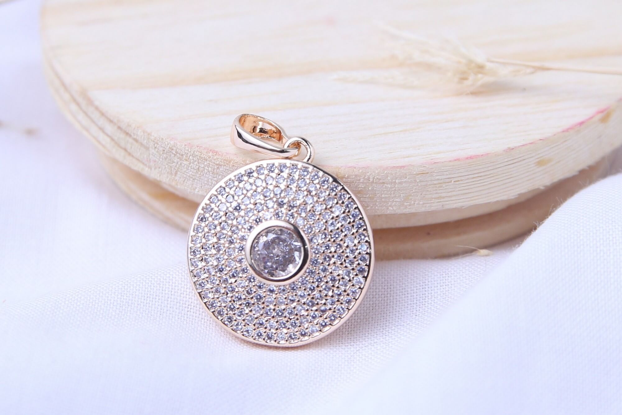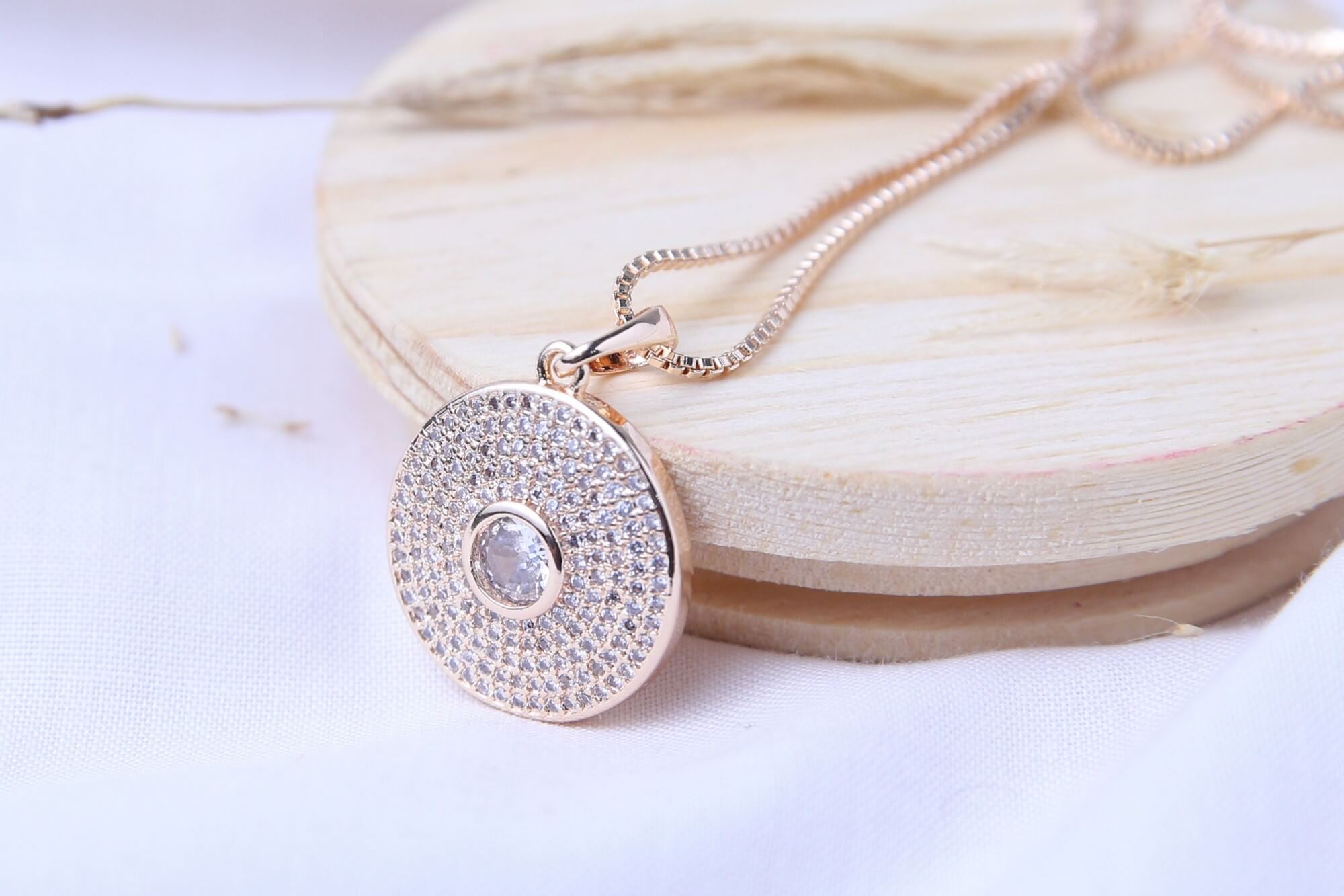 This captivating pendant necklace features a circular disc lavishly paved with shimmering clear crystals, creating a dazzling and textured surface. A slightly larger, clear crystal sits at the center, drawing the eye and adding depth to the design. The warm rose gold-toned setting enhances the sparkle of the crystals and adds a touch of modern elegance. The pendant hangs from a delicate, matching chain, making it a perfect accessory to add a touch of sophisticated glamour to any outfit.