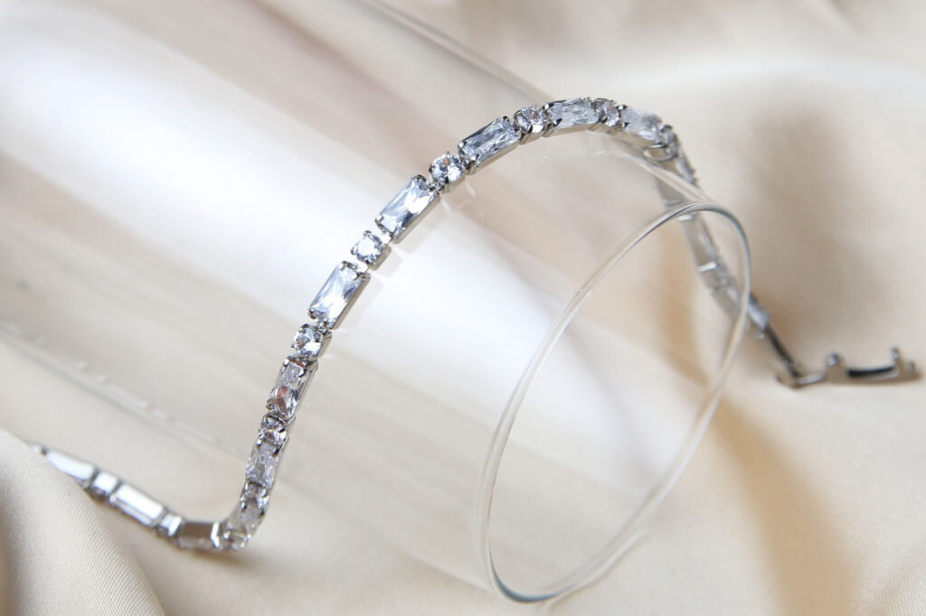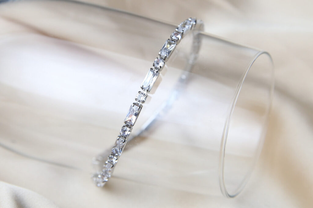 Elevate your outfit with this stunning silver-tone bracelet features a captivating design of alternating rectangular and round crystals. The sleek, modern design is perfect for adding a touch of sparkle to any outfit, from casual to formal. It’s a versatile accessory that effortlessly complements any style. This bracelet also makes a thoughtful gift for a loved one, symbolizing elegance and affection.