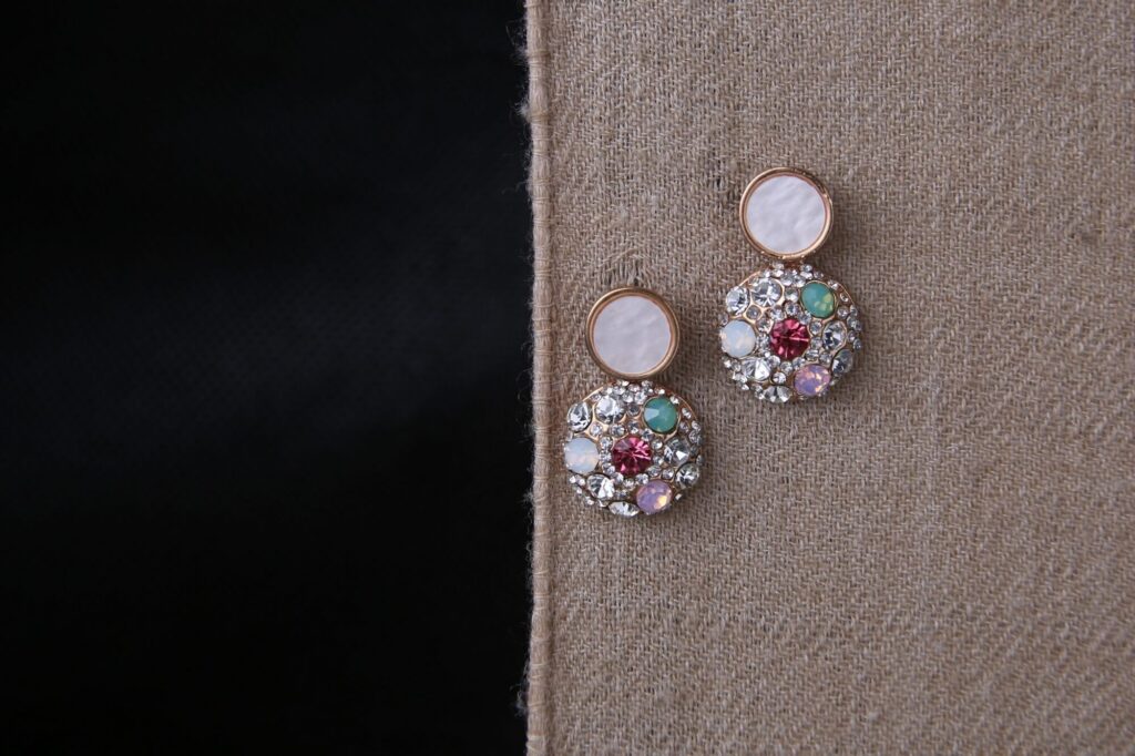 These captivating earrings feature a dazzling cluster of sparkling crystals and colorful gemstones, creating a vibrant and eye-catching design. The round silhouette is adorned with an array of shimmering elements, including a central gemstone surrounded by a halo of crystals and smaller, multi-colored gems. A unique, flat disc sits in the cluster, adding a touch of modern sophistication. These earrings are perfect for adding a touch of glamour and personality to any outfit, whether for a special occasion or to elevate your everyday style. The secure clasp ensures comfortable and confident wear throughout the day or night.