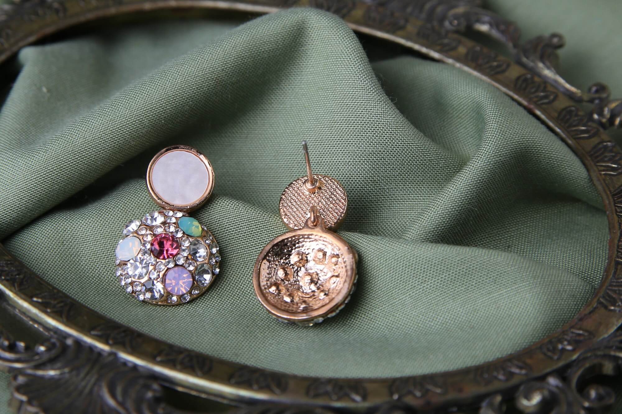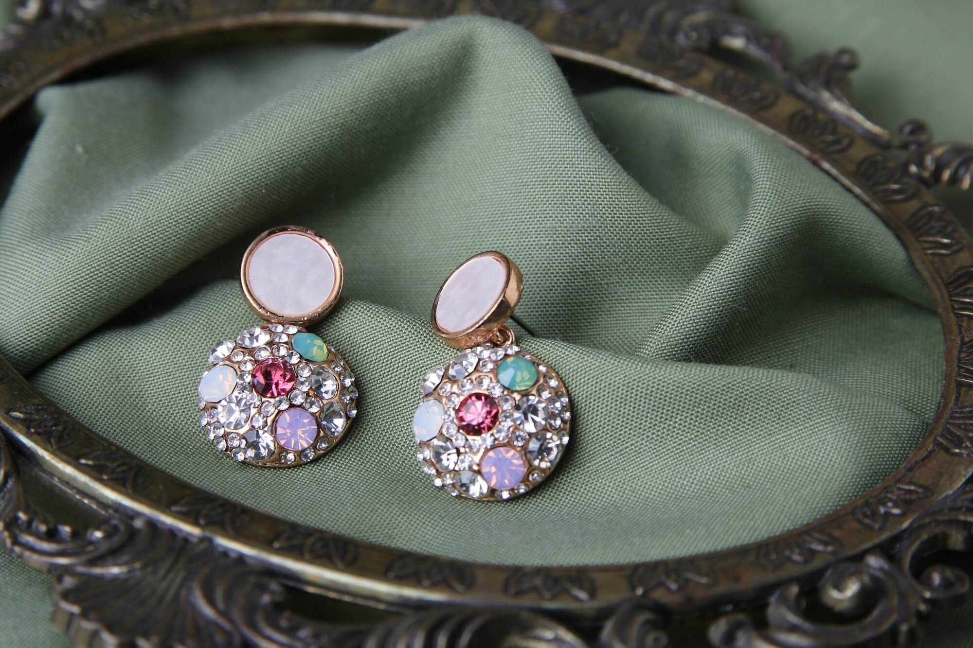These captivating earrings feature a dazzling cluster of sparkling crystals and colorful gemstones, creating a vibrant and eye-catching design. The round silhouette is adorned with an array of shimmering elements, including a central gemstone surrounded by a halo of crystals and smaller, multi-colored gems. A unique, flat disc sits in the cluster, adding a touch of modern sophistication. These earrings are perfect for adding a touch of glamour and personality to any outfit, whether for a special occasion or to elevate your everyday style. The secure clasp ensures comfortable and confident wear throughout the day or night.